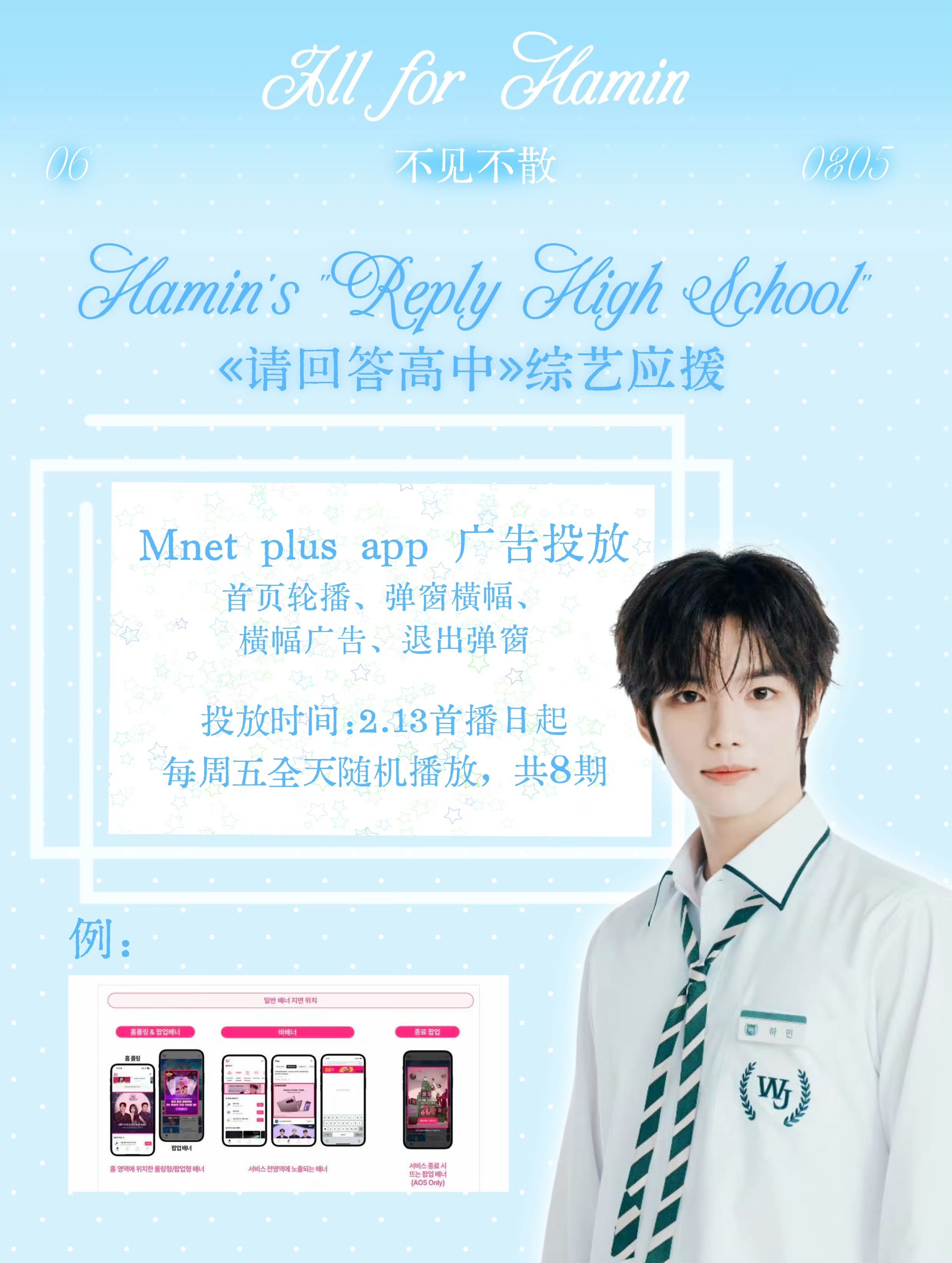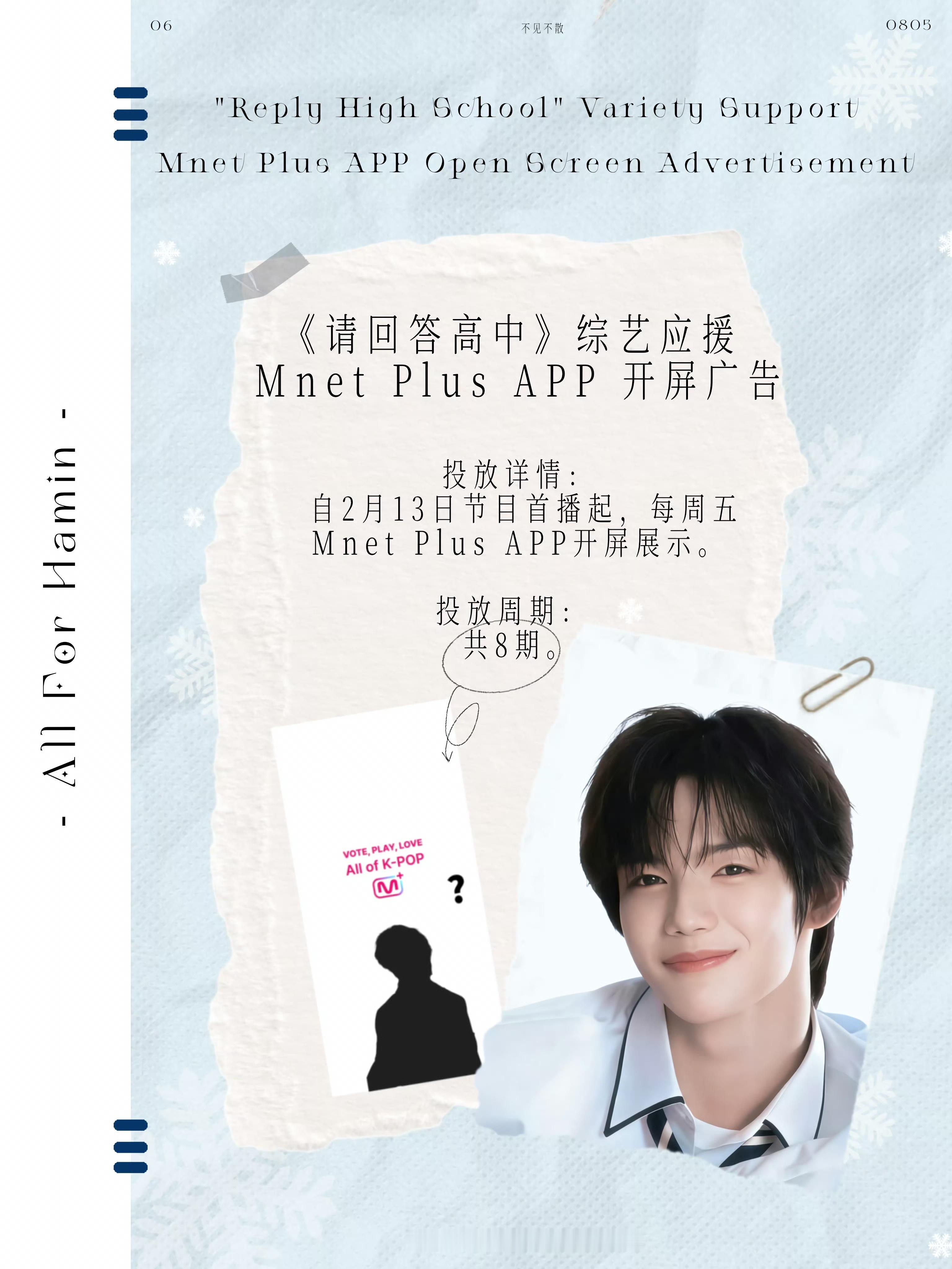 综艺《请回答高中》播出期间,李河民粉丝霸气承包Mnet Plus APP所有应援位!前置、中插视频广告+开屏应援+首页轮播+弹窗+横幅+退出弹窗全覆盖,满屏爱意,让李河民被偏爱牢牢包围,卷丝的爱永远倾向李河民~请回答高中综艺李河民应援