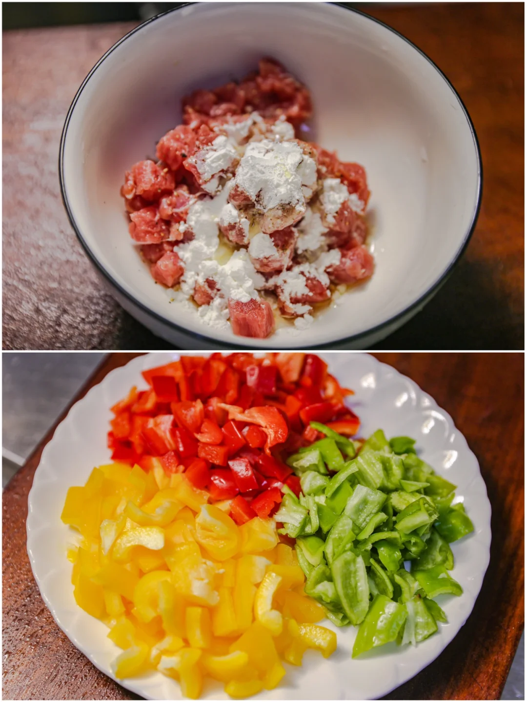 1.牛里脊肉切成小丁,加入黄酒,黑胡椒丁,淀粉拌匀后,腌制10分钟。