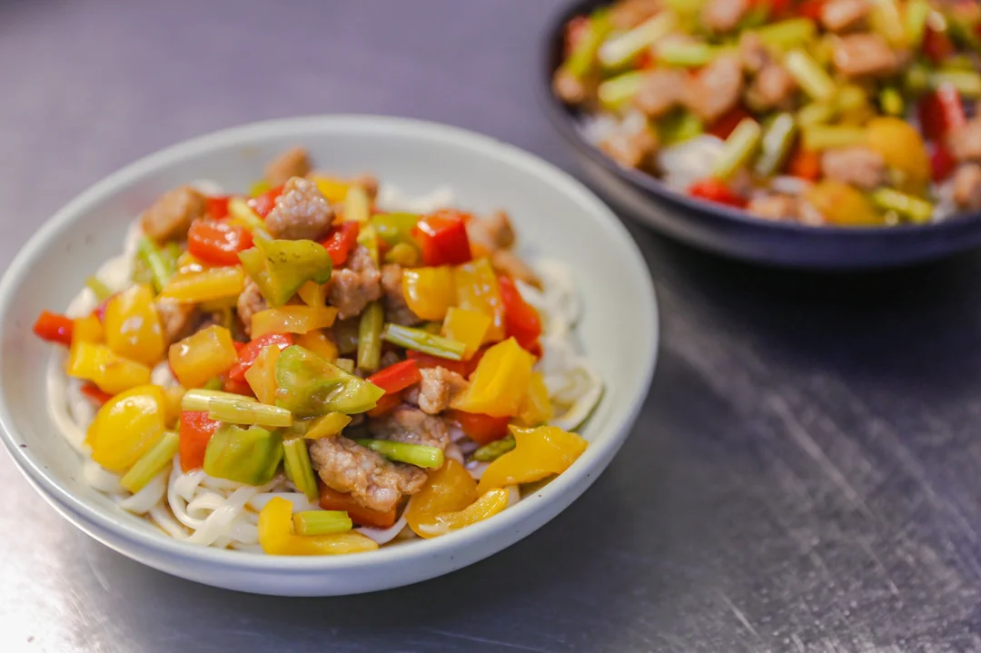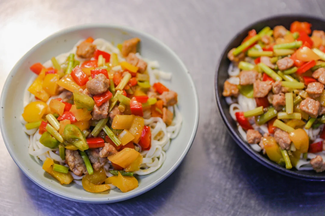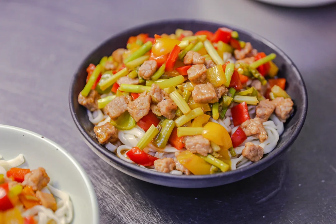 6.将烧好的彩椒牛肉丁椒浇在面条上即可。