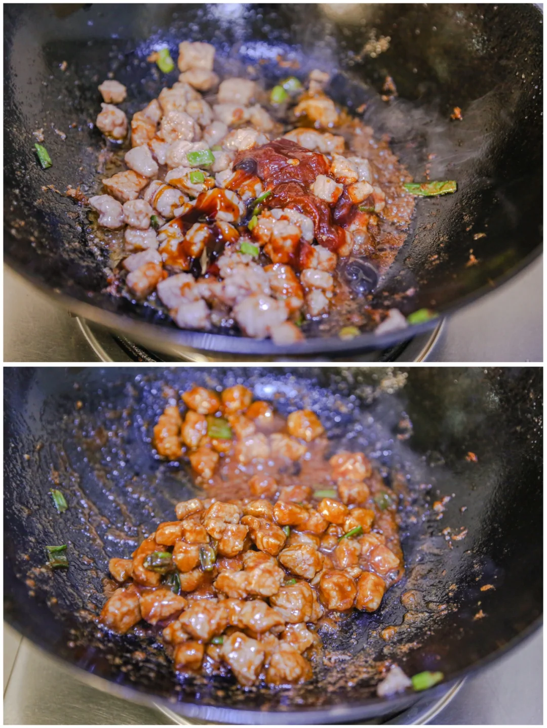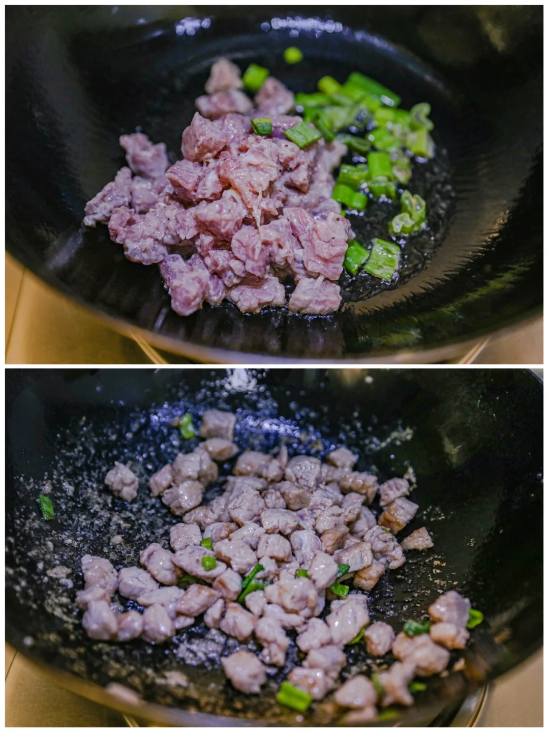 3.锅里加入植物油,稍微一热的时候放入蒜末葱花爆香,加入牛里脊肉丁翻炒变色。