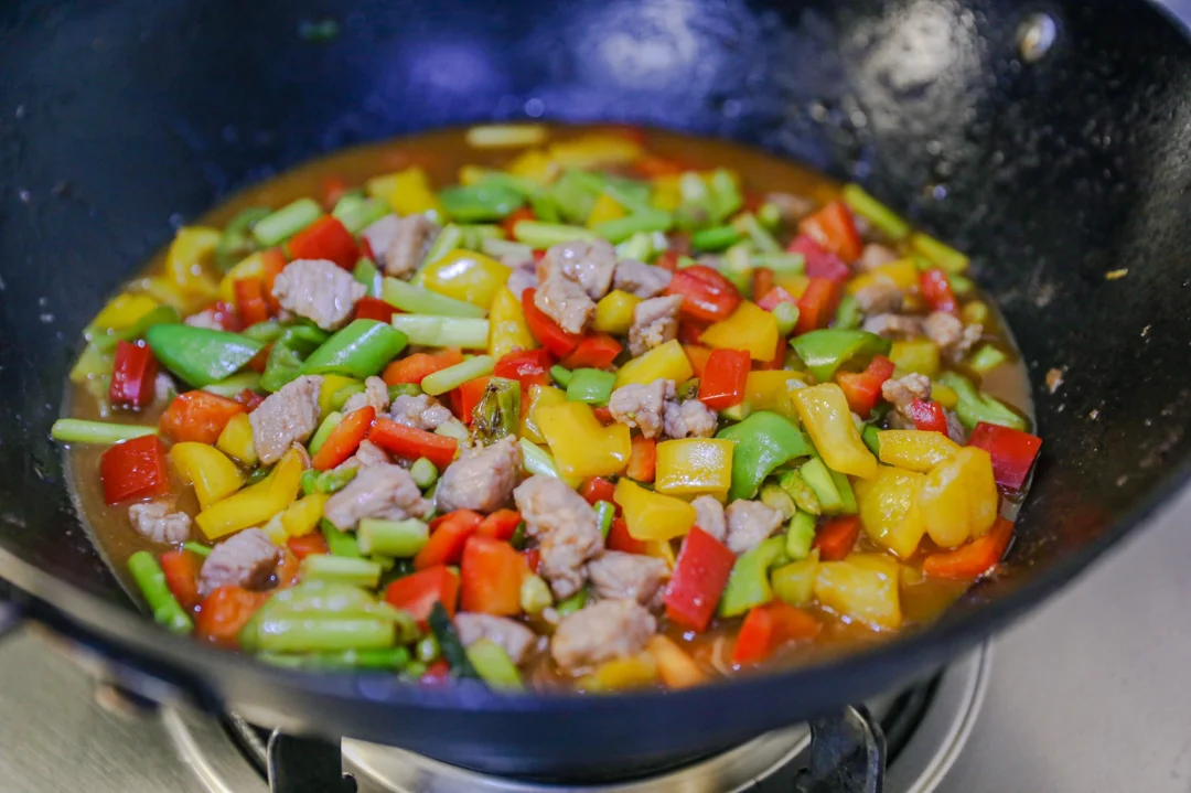4.加入彩椒粒,加入少许排骨酱,生抽,食盐调味,如果喜欢吃汤水多的可以稍微加一点热水,煮到牛肉熟即可。