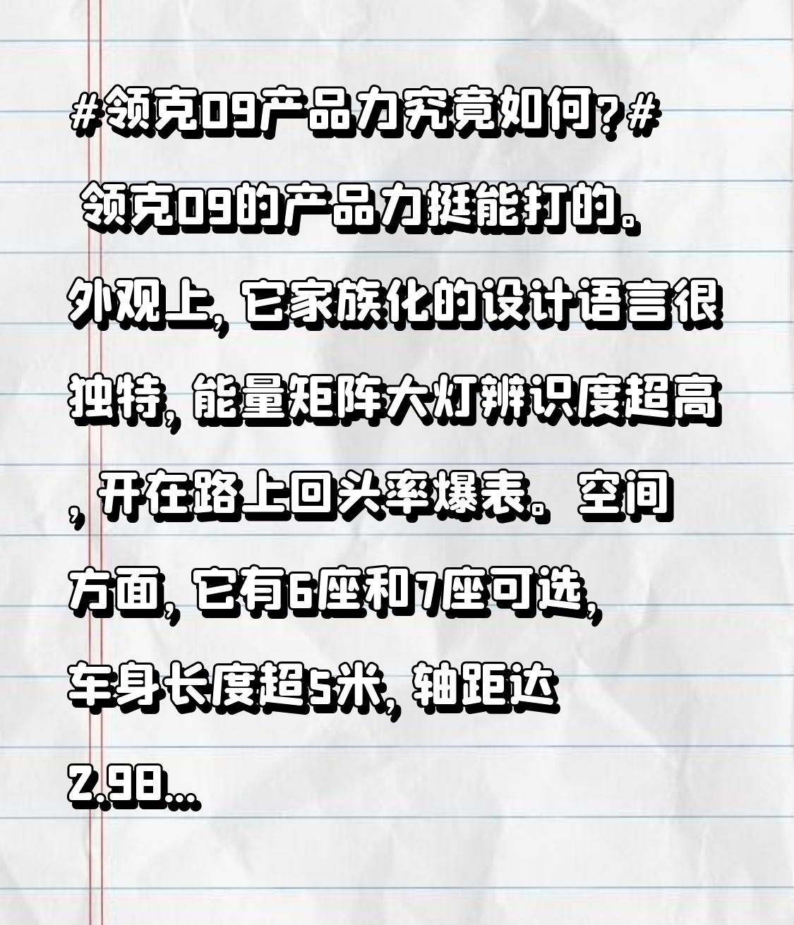 领克09产品力究竟如何? 领克09的产品力挺能打的。外观上,它家族化的设计语言很独特,能量矩阵大灯辨识度超高,开在路上回头率爆表。 空间方面,它有6座和7座可选,车身长度超5米,轴距达2.98米,后排空间宽敞,一家人出行也不拥挤。 动力上,有燃油和插混版本。插混版动力强劲,加速迅猛,纯电续航能满足日常通勤。 配置也丰富,像L2级智能驾驶辅助、燕飞利仕音响等一应俱全。不过车机偶尔会有卡顿现象。总体而言,领克09产品力不错,是个值得考虑的选择。
