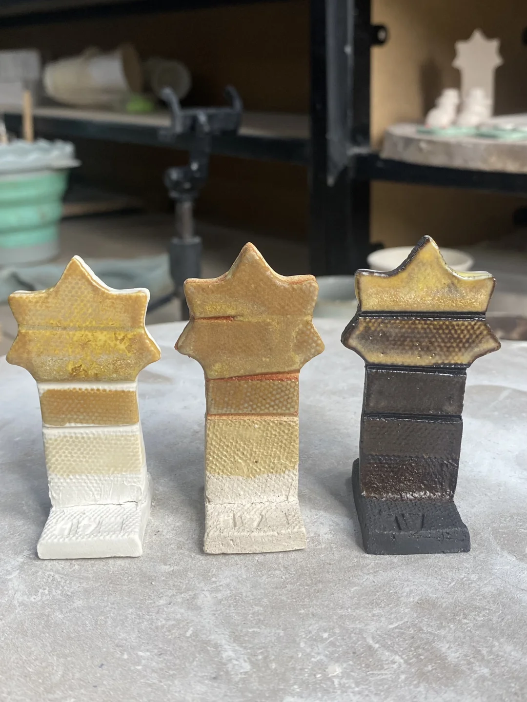 这两天工作室在装修就没去干活,休息休息 浅浅再存一下做的试片的颜色 釉料真的很神奇 感觉还是喜欢黄一点的匣钵泥
