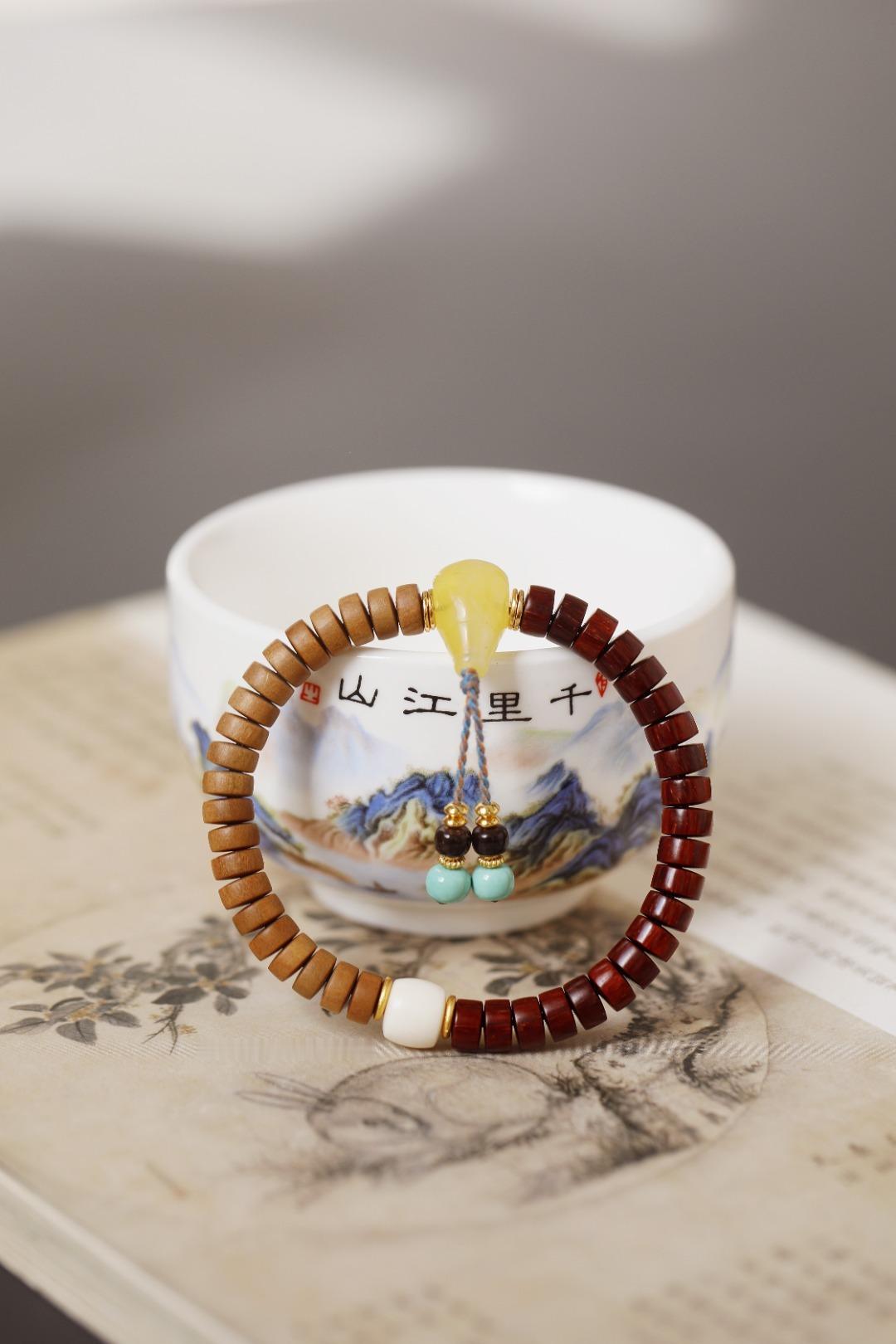 老山檀香气迷人,大自然的馈赠木香,紫檀油润质坚,清新而不失优雅;珍宝相配,增添富丽色彩。