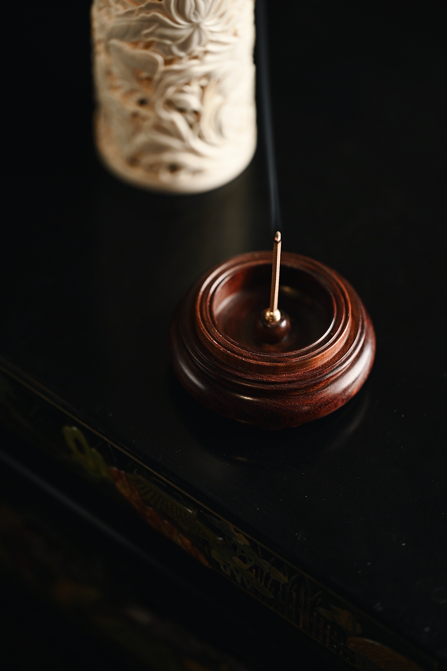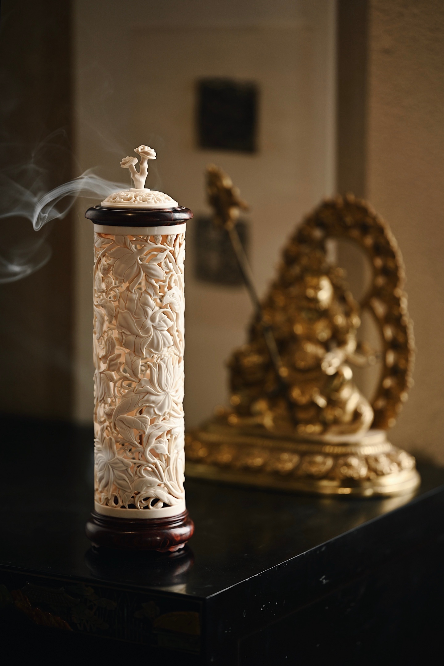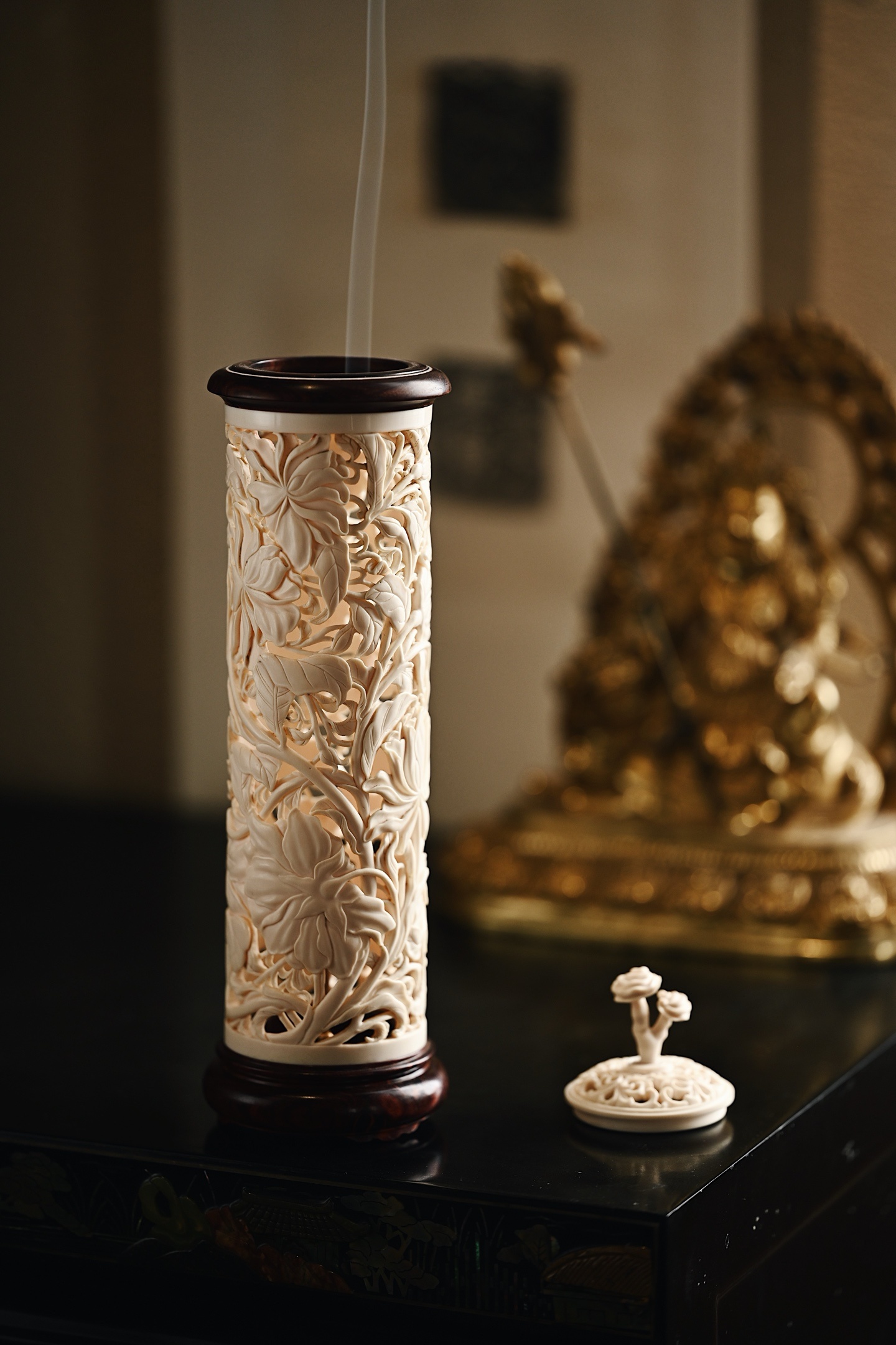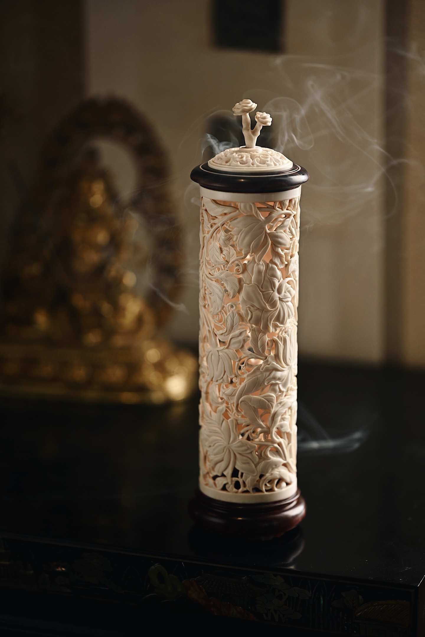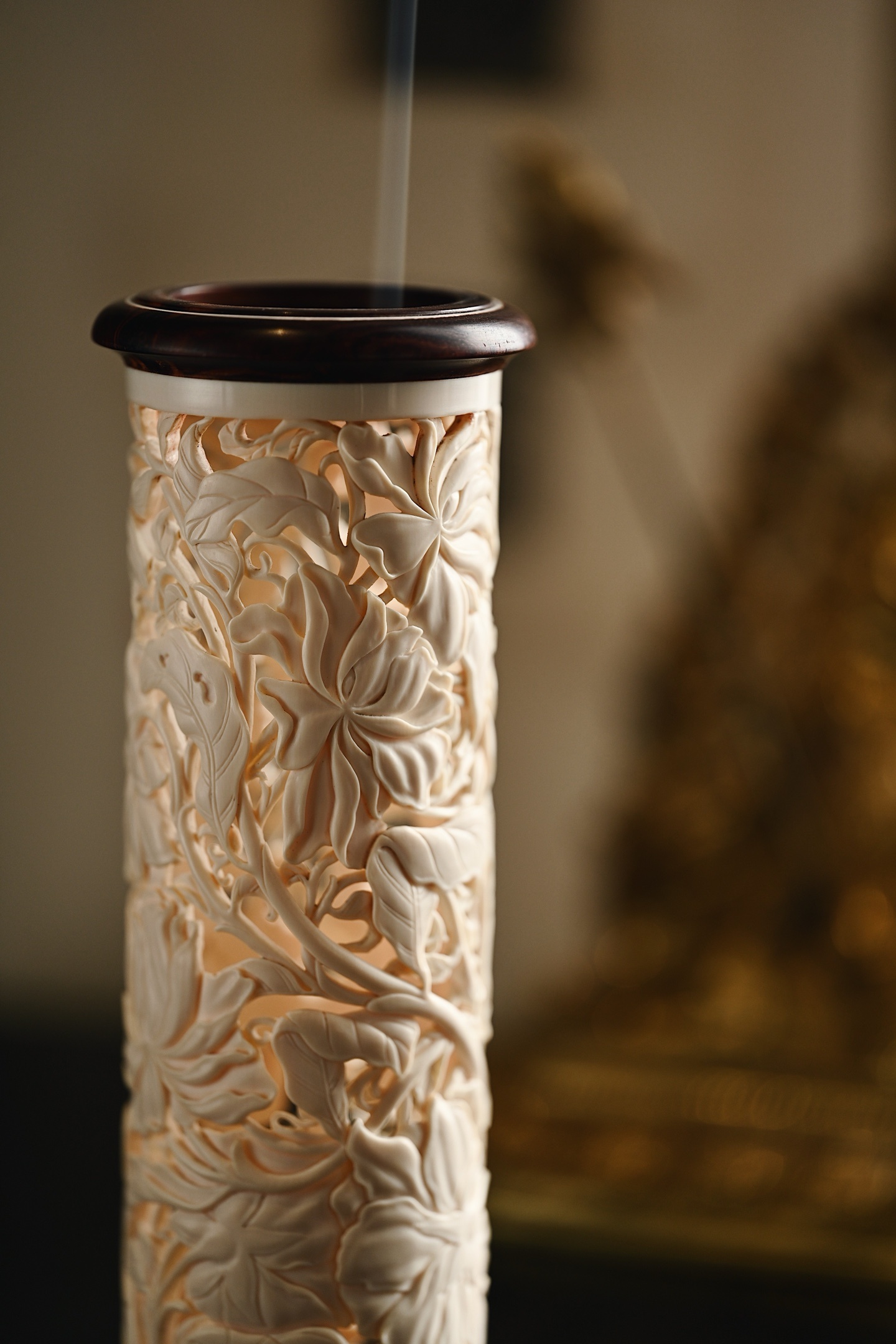 料质坚密,色泽清雅有韵,外壁满雕缠枝花卉,刀法细腻,布局紧凑,焚香幽赏,风雅入骨,意趣自然。