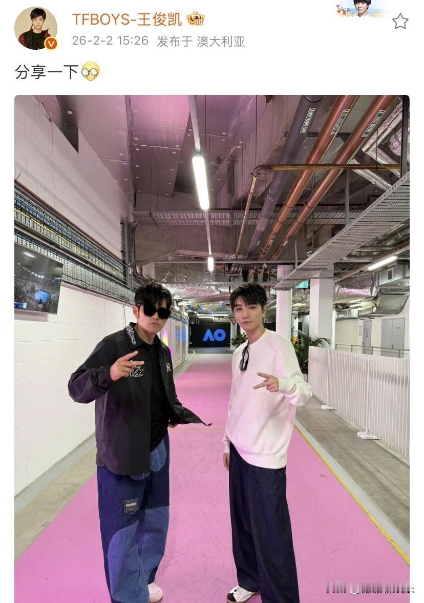 陈奕迅和王俊凯,高调发文。 2月2日,陈奕迅在社交平台发文: “澳洲第一打,天气晴朗的墨尔本,配上这位特别的拍档,让这一次的旅程更加独特,多谢周同学的邀请,期待下一次快些来临。” 还配了一张和周杰伦的合照,两人都是运动风,站在球网旁边,这一看都是刚打完网球。 王俊凯也在社交平台发文,他的发文很简短: “分享一下。” 就这简单的四个字,配了一张和周杰伦的合照,王俊凯这是赤裸裸的在炫耀,炫耀又一次和偶像见面了,追星能追成王俊凯这样,那简直太幸福了。 陈奕迅王俊凯发文,为什么都不发他们三人的合照呢? 近日,他们三人现身澳网,三人坐在观众席观看比赛,还会一起讨论赛况,之后还有网友拍到,他们三人一起现身火锅店吃火锅,不得不说王俊凯运气真好,和两位非常有实力的歌手人坐在一起,获得两位前辈的认可,感觉下一秒两位都要为王俊凯写歌了。 唯一的遗憾是,没有看到他们彼此发三人的合照,不过他们三人能同框,已经是非常让人羡慕的画面了。