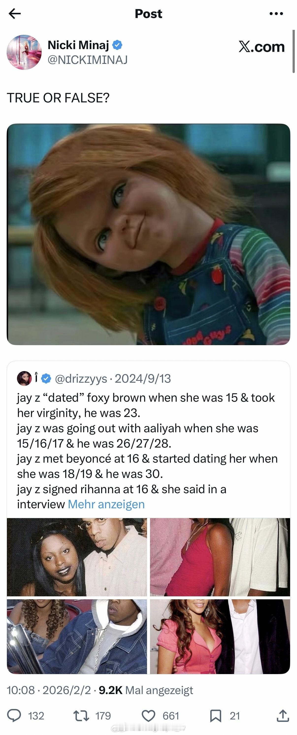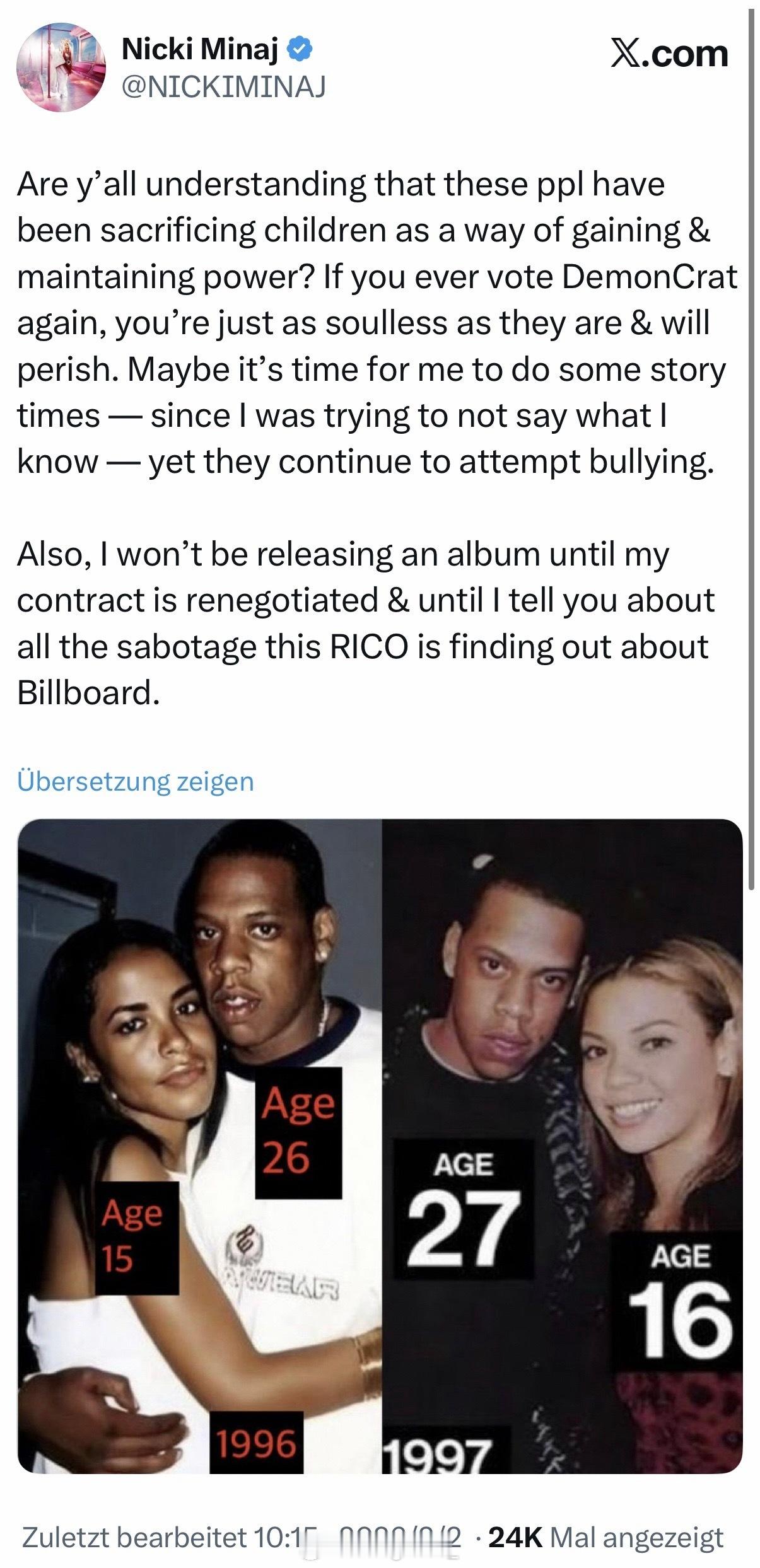 Nicki Minaj还转发了一则说JayZ在大量明星未成年时就和其恋爱,表示:真的假的?