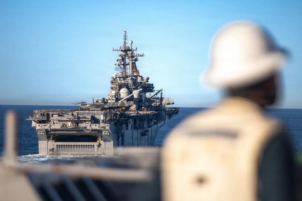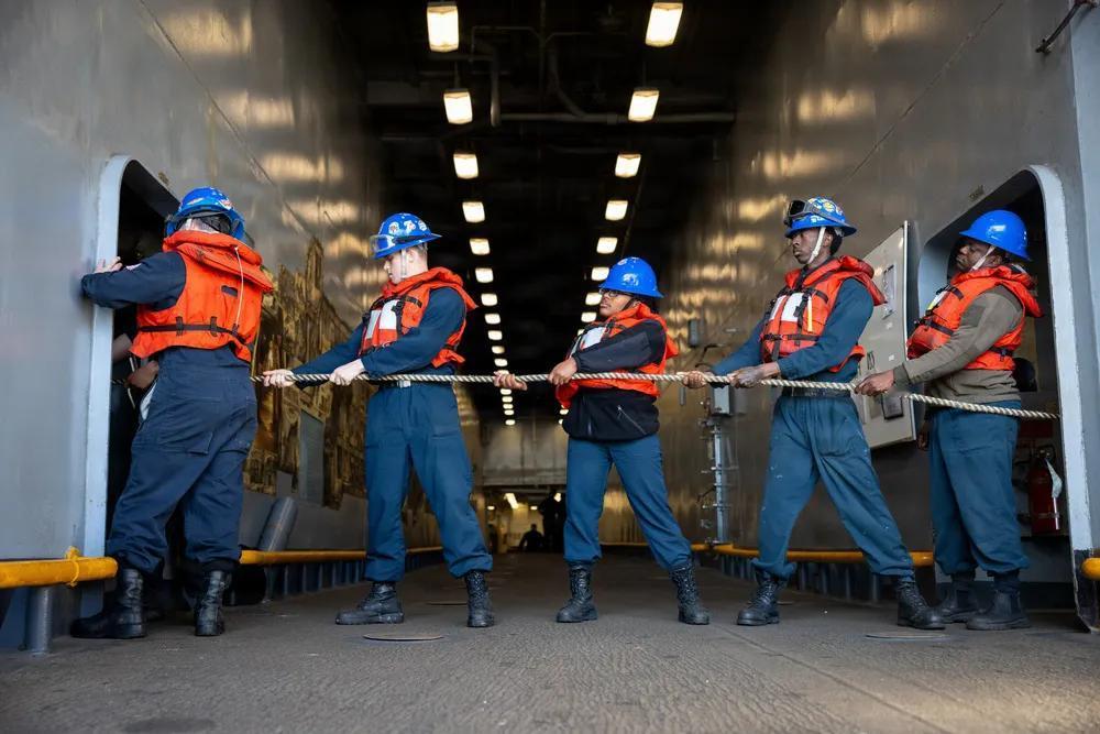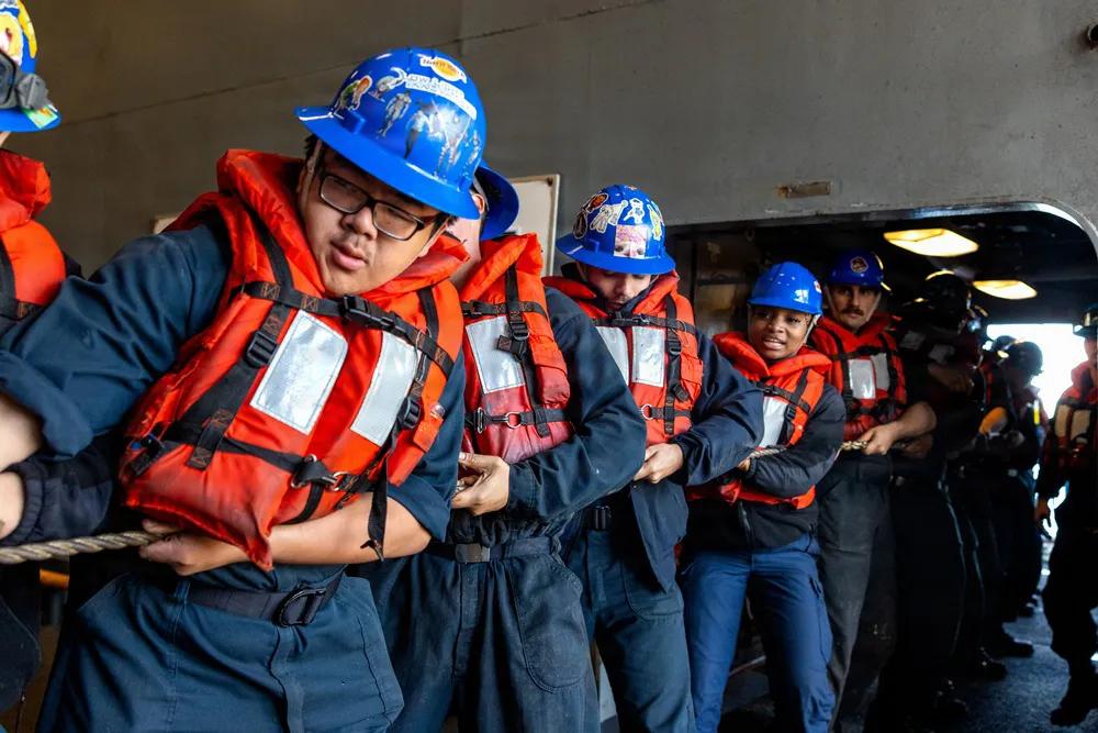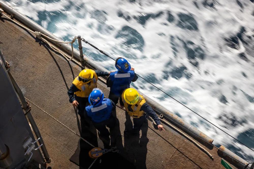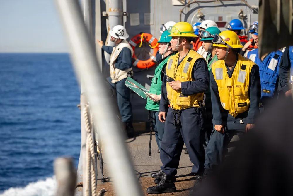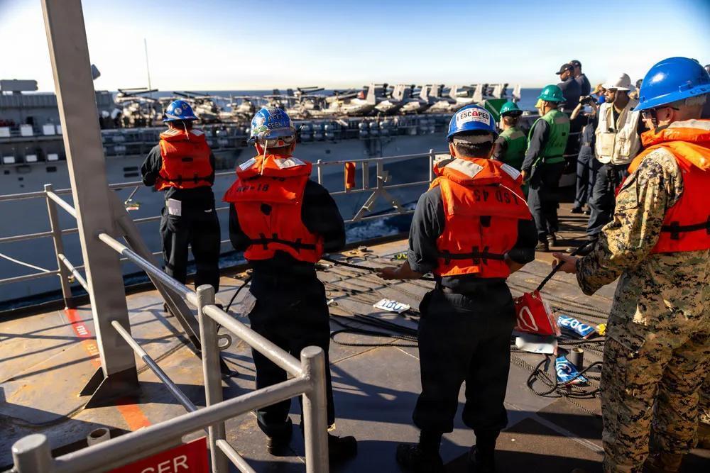 2026年1月30日,太平洋,隶属于美国海军黄蜂级两栖攻击舰“拳师号”(LHD 4)的水手,在太平洋进行一场模拟舰船加油补给作业。 第11海军远征部队目前正在美国第三舰队作战区的拳师两栖准备群上执行综合训练,提升杀伤力和作战准备能力。