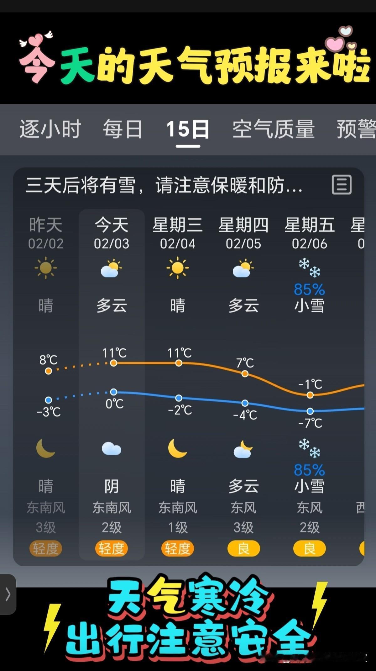 🌻早安问候🌻 𝙂𝙤𝙤𝙙 𝙈𝙤𝙧𝙣𝙞𝙣𝙜 今天是: 2026年2月3日 农历:乙巳年腊月十六 星期二 签到成功,获得3个创业卷,已连续签到3天! 今日天气: 阴,三天后将有雪,注意保暖,做好防范。本周以多云为主,阳光较少。 空气质量: 轻度污染。 儿童、老年人及心脏病、呼吸系统疾病患者应尽量减少体力消耗大的户外活动。 气温:11℃~1℃ 昼夜温差非常大,人体感觉寒冷不适,注意添衣保暖防冻。 湿度:58% 风向:西南风 风力:1级 紫外线:1级,最弱紫外线辐射天气,无需特别防护。若长期在户外,建议涂擦SPF在8-12之间的防晒护肤品。 日出:7:25 日落:17:47 ꧁ 🍄꧂ 🌷🌴🍒 有缘👬才有每天的问候☕️有心💝才有每时的牵挂👫有情❤️才有每日的祝福🙏 ㊗️愿我们健康平安快乐每一天💃 ʚ🌻ɞ早安☕️