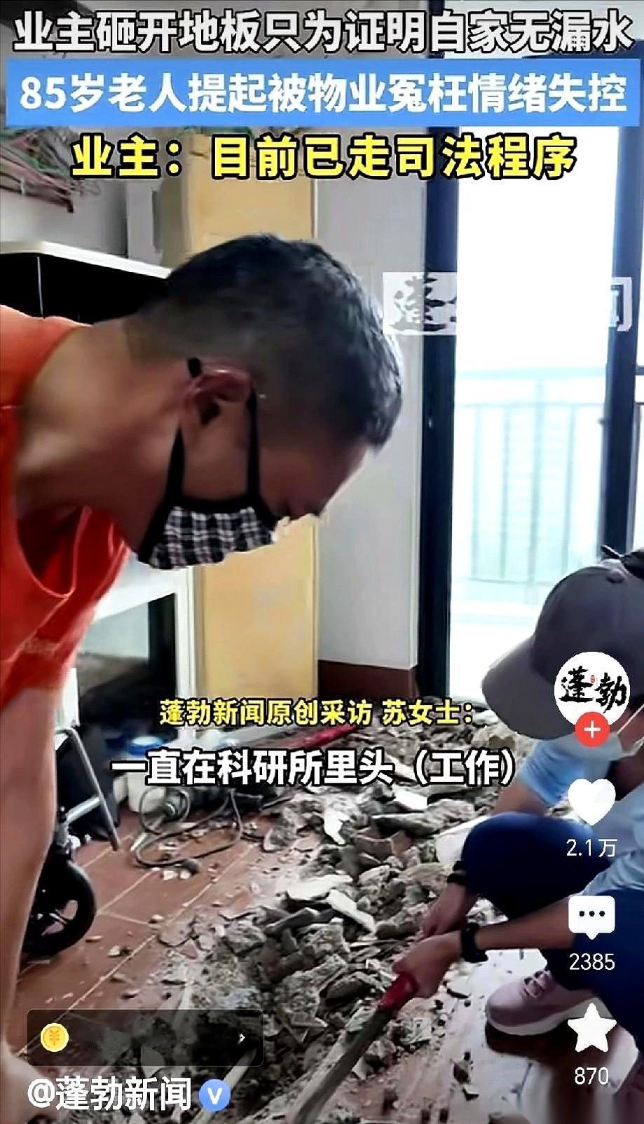 海口那个85岁的老爷子,亲手砸了自己三万块钱的精装修,就为了跟楼下几百块的宾馆费,死磕到底。 电镐嗡嗡作响,瓷砖碎片像下雨一样崩开。灰尘呛得人睁不开眼,一屋子人就这么盯着。 楼下漏水,停电了。物业二话不说,一口咬定,就是楼上老爷子家干的。连门都没进,勘察报告一个字没有。 老爷子一辈子搞科研,高考状元出身,信的是数据,是事实。他当场就火了,这不讲道理。 他自己掏钱,请来最专业的师傅,上门做水管压力测试。压力表指针纹丝不动,报告白纸黑字:管道,没漏。 他把报告递过去。 物业经理眼皮都没抬,手指轻轻一弹,把报告弹开:“你找的这公司不行,我们不认。” 一句话,把老爷子一辈子的信仰给干碎了。 女儿从国外连夜飞回来,看着父亲通红的眼睛,一个字没多说,直接叫来装修队、公证员,还有一帮扛着摄像机的记者。 不信科学是吧?那就信眼睛。 砸。 当着所有人的面,砸开地板,砸开水泥,一直砸到那根被“指控”的水管。 电镐声停了。全场死寂。 那根水管就静静地躺在那,干得掉渣,连一丁点水汽都没有。 所有人都看着物业的人。 那个经理,面不改色地走上前,围着管子转了一圈,然后说:“可能是半夜漏的,白天自己干了。” 现场有个记者没忍住,呛了一下。 经理又补充一句:“再说,你现在没修管子,怎么证明它之前漏过水?” 这话一出,视频那头的老爷子,一个快九十岁的老人,当着所有人的面,像个孩子一样嚎啕大哭。他指着屏幕,手抖得不成样子,嘶吼着:“这事搞不清楚,我死不瞑目啊!” 他争的哪里是几百块钱。 他砸的也不是地板,是他毕生恪守的两个字:清白。 最后,物业提出,可以减免一部分物业费,这事就算了。 女儿直接把房子挂牌出售。 有些地方,你赢了道理,但还是得搬家。因为你永远叫不醒一个揣着明白装糊涂的人。