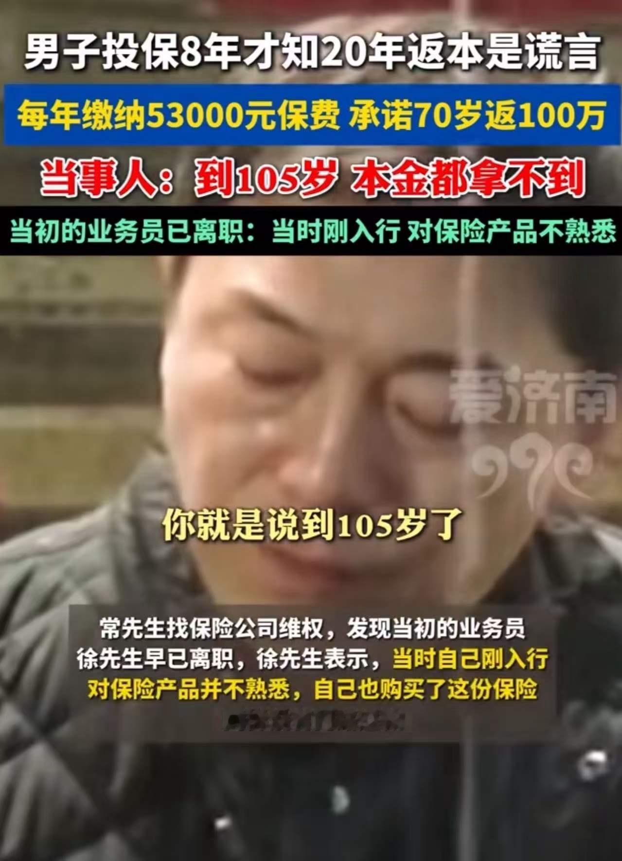 在这个信息爆炸、理财多元的时代,保险本应是我们为未来生活增添保障的坚实盾牌,却在某些情况下变成了令人心碎的“陷阱”。一位男子,每年缴纳53000元的保费,整整坚持了8年,满怀期待地等待着20年的返还,却在关键时刻发现自己被“套路”了——所谓的“20年返本”竟然是个谎言!更令人心寒的是,他坦言:“就算我活到105岁,连本金都拿不到!” 这背后隐藏的,是多少家庭的信任被践踏,是多少普通人在保险陷阱中迷失。男子的遭遇,令人愤怒,也令人深思:我们购买保险的初衷,是为了保障,是为了未来的安心,可为什么会变成一种“骗局”? 更令人唏嘘的是,那位当初推销的业务员,竟然在离职后坦言:“当时刚入行,对保险产品不熟悉。”这句话如同一记重击,让人不得不反思:我们身边的保险代理,是否都在用专业和责任心为客户守护?还是有人只为业绩、只为利益,利用客户的信任在“玩套路”? 网友们纷纷评论:“本来买保险是为了保障,结果变成了诈骗一样的陷阱!”“保险公司是不是该负责任?消费者的权益怎么保障?”“我们需要的是透明、真诚的保险产品,而不是套路和谎言!” 这件事让我们看清了一个残酷的现实:在追求财富和保障的道路上,不能盲目相信任何“看似美好的承诺”。我们要学会用理性去审视每一份合同,用心去辨别每一个条款。更重要的是,监管部门应加强监管,打击虚假宣传和不良销售行为,让保险行业回归本质——守护而非欺骗。 人生在世,谁都希望安稳、希望未来无忧。可如果连最基本的保障都被“套路”了,谁还能心安理得?我们不能让那些“业务员”的一句“我不熟悉”成为我们家庭的悲剧。每个人都应成为自己权益的第一守护者,用法律和知识武装自己,拒绝成为被“套路”的那一方。 这起事件,警醒我们:保险不是赌博,不是投机,而是责任和信任的承诺。让我们共同呼吁:透明、诚信的保险环境,才是我们每个人真正需要的保障。别让虚假承诺成为我们未来的阴影,让正能量和理性成为我们前行的灯塔!保险深度解析 保险避坑知识