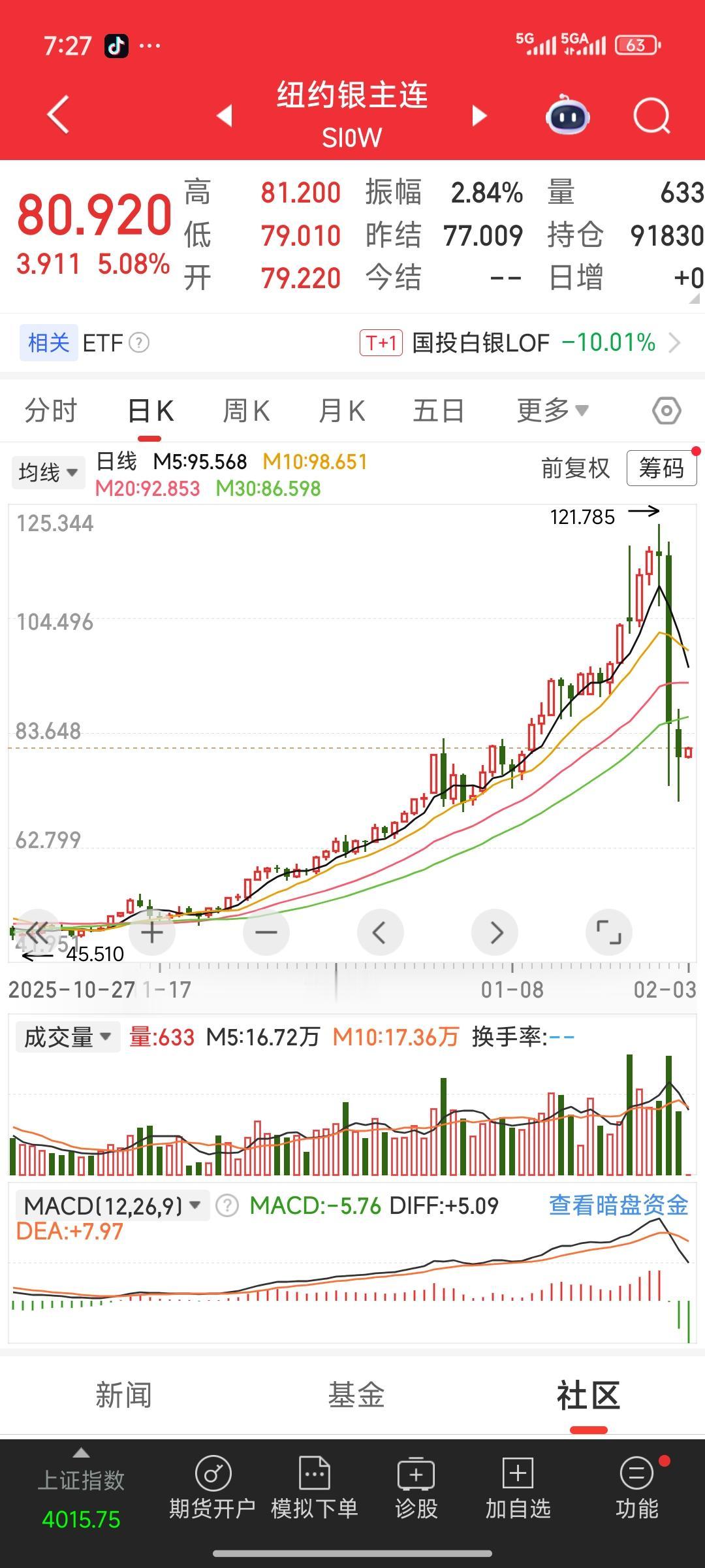 今日一早,纽约黄金与纽约白银均止跌回升,大幅上扬。这对今日开盘的A股重金属板块起到了利好作用。我认为,今日大部分贵金属、金行、银行股会打开跌停板,不会一直被一字封死。当市场开始出现分歧时,也是给持有跌停股的投资者提供了出逃机会。 我个人觉得可以小仓位介入一些,毕竟在这个不稳定的世界,金银等贵金属的上升通道应该不会改变,目前的上升趋势依旧延续。从目前情况来看,这里更可能是中期调整,属于上升中继。 所以,如果时机合适,我准备稍微买入几手,后续再根据情况决定是否加仓。我把前几天从天通股份卖出的资金,用来潜伏黄金、白银相关股票了。 黄金白银价格 白银价格疯涨 白银市场行情 白银贵金属 黄金白银 白银价格行情 白银追跌