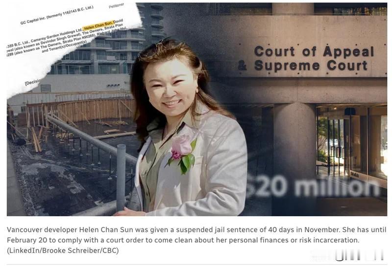 加拿大华裔女地产大亨装穷耍赖:如再不如实交代个人财务将被送进监狱 孙婵(音译:Helen Chan Sun,音译),加拿大温哥华Landmark Premiere Properties 地产公司的掌舵人,参与多个大温住宅项目,曾在 2018 年申报个人净资产 9,400 万加元。如今法官被判她藐视法庭,获 40 天监禁,缓期至 2 月 20 日。如果届时仍不如实交代个人财务,她被送进监狱。 孙婵是 Landmark Premiere Properties 公司的唯一股东兼首席执行官,在温哥华拥有多个住宅开发项目。就在几年前,她的身价还高达 $9,400 万加元,到了 2023 年,她在财务报表中称自己只剩 $2,100 万加元了。 2018 年孙婵为两家公司担保了一笔 $450 万加元的贷款。公司倒闭后,债权人 GC Capital 开始向担保人追债。孙婵原本同意分期偿还 $560 万加元,但在付了 $300 万后,她在 2022 年夏天突然停止了还款。 在法庭审理中, 49 岁的孙婵极力塑造一种「现金拮据」的形象。她声称: 住养老房子: 她说自己和母亲住在温西的一处住宅里。 领低保工资: 自称年薪仅为 $60,000 至 $70,000 加元。 资产极简: 声称名下只有一张银行卡和一张信用卡。 针对剩余近 $350 万加元的欠债,她竟然提出每个月只还 $3,000 加元。一位法官当场指出:「按照这个速度,你得花 80 多年才能还清债务。」 然而,法官理查德·福勒(Richard Fowler)并不买账。他犀利地指出,孙婵的日常生活充满了名牌消费和豪华车辆,这与她声称的低收入完全不符。 法官甚至直接告诉她的律师:「你的委托人必须明白,她现在正悬在一根非常、非常、非常细的线上。企图混淆视听和阻挠执法的时代已经过去了。 在法庭取证过程中,孙婵与债权方律师拉维·希拉(Ravi Hira)发生了激烈的正面交锋。当希拉要求她清空手提包,展示里面的现金和信用卡时,孙婵表现得非常抵触,甚至当众指责希拉「态度有问题」。 律师希拉在结案陈词中向法官列举了她的奢侈生活:「她的生活方式显示她的收入远高于自称的水平。她不用付房租,却每月花数千加元购买奢侈品,包括爱马仕(Hermes)、阿玛尼(Armani)、迪奥(Dior)和卡地亚(Cartier)珠宝。」 负责记录的官员也表示,孙婵的证词「回避且闪烁其词」。最终,法官因她藐视法庭裁定其入狱 40 天,但给予了缓刑期至 2 月 20 日。她必须在2月20日前遵守财务披露令如实交代个人财务状况,否则将面临牢狱之灾。 除了债务,孙婵还面临着加拿大税务局(CRA)高达 $600 万加元的税单。法官福勒表示,不需要什么「法务会计师」也能看出她财务披露中的巨大漏洞。比如,她公司账目中竟然有一笔高达 $780,000 加元的「咨询费」,却没有具体解释。 法官福勒严肃地表示,孙婵必须意识到自己正站在十字路口:「送一位女商人去坐牢确实是个挑战,但别担心,如果我认为这合适,我做起来一点困难都没有。」 「把一名女企业家送进监狱确实是个挑战……但如果我认为有必要,我不会犹豫。」