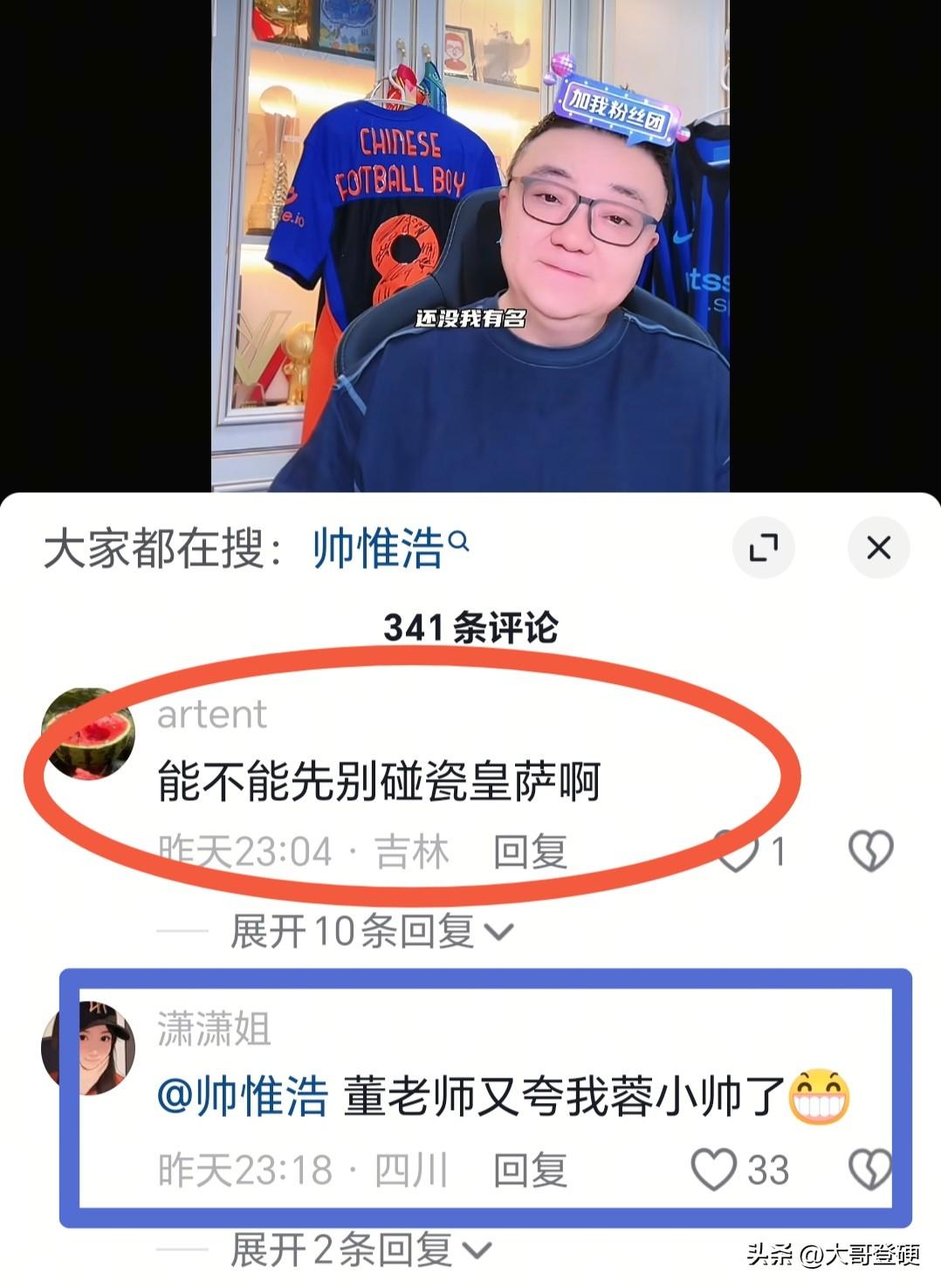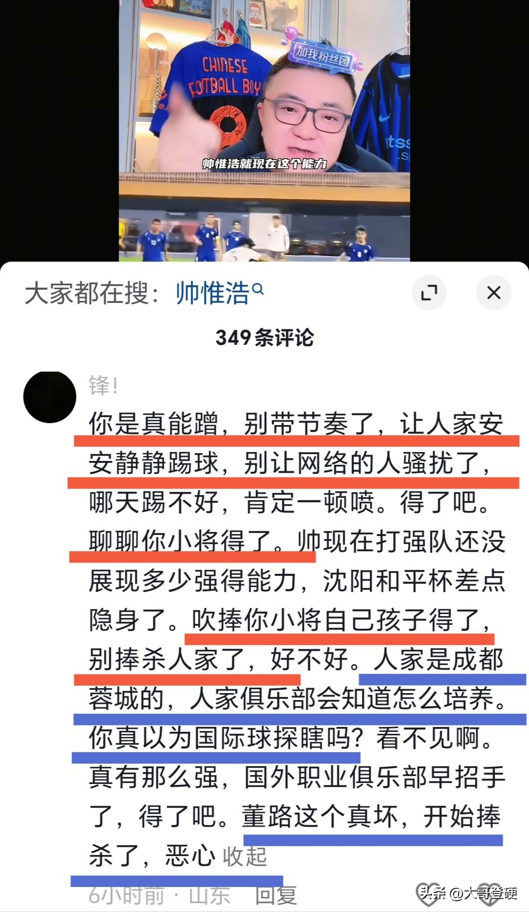 ⚠️⚠️董路,请不要捧杀帅惟浩⚠️⚠️ 北京时间2月2日晚,足球小将项目发起人、自媒体人董路,在其个人社交媒体上发出作品,对09国少队的前锋帅惟浩,进行了一番“盛赞”,董路认为以帅惟浩现在的能力,可以打同龄的巴萨和皇马……[震惊] 这样的表述,让不少理性的球迷,都看不下去了,纷纷在评论区留言,表达了自己清醒的认知[惊呆] 客观而言,说帅惟浩是目前09国少锋线第一人,这个不夸张,但把帅惟浩捧到可以打同龄巴萨皇马的高度,这多少有点儿扯蛋了[发怒] 评论区一位球迷留言中的几句话堪称经典:你是真能蹭,别带节奏了,让人家安安静静踢球……吹捧你小将自己孩子得了,别捧杀人家了…… 还是继续吹捧凭借一记外脚背,被西班牙主教练相中的莱里达太子吧,毕竟小帅是失败者联盟培养的,不是西班牙培养的[哈欠] 对于一个刚成名不久,还没踢上一场中超联赛的年轻球员而言,未来一切都有变数,盲目的吹捧对其的成长,真的是有百害而无一利[叹气] 目前看来,老唐当初说的那句“踢球孩子和家长,要远离无良自媒体”的含金量仍在提升[强]