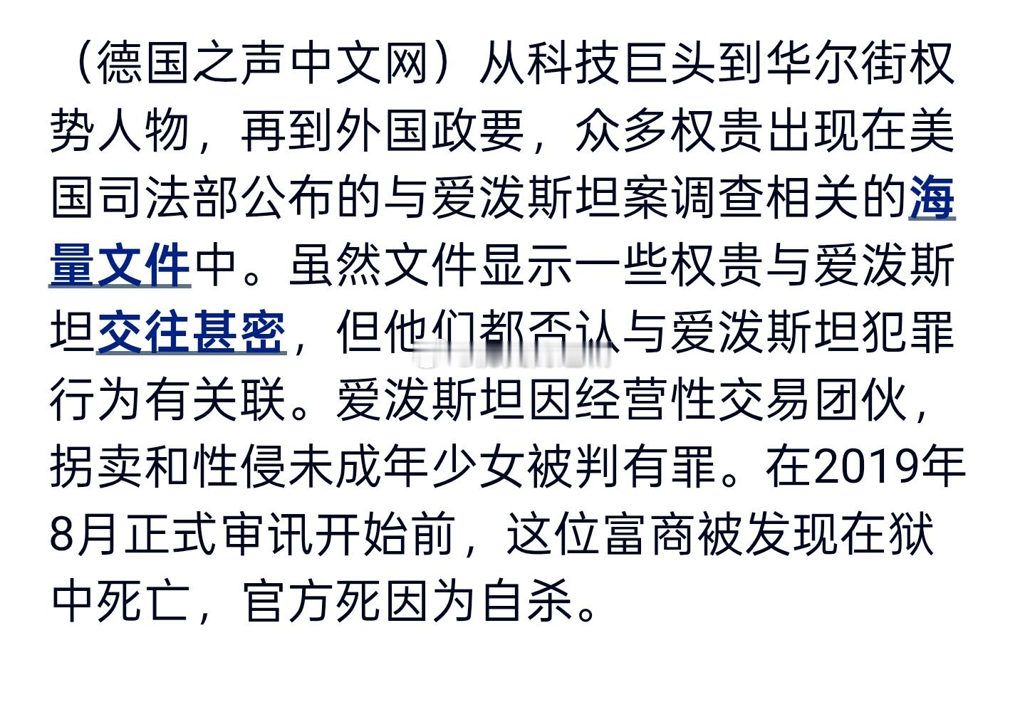 DW报道,从科技巨头到华尔街权势人物,再到外国政要,众多权贵出现在美国司法部最新公开的爱泼斯坦案约300万份海量文件中。虽然他们矢口否定同爱泼斯坦的罪行有关,但这些文件反映出他们之间撇不清的干系。美国的比尔盖茨,克林顿,英国前安德鲁王子都在名单上。 海外新鲜事