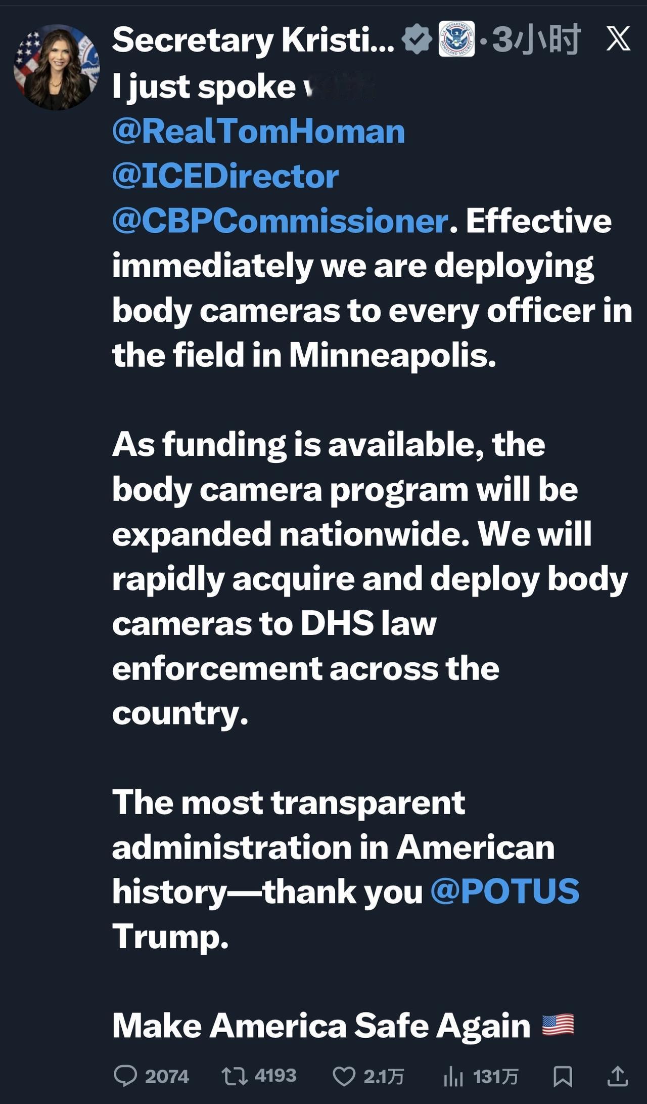 美国国土安全部部长克里斯蒂·诺姆表示,所有在明尼阿波利斯一线工作的国土安全部官员都将配备执法记录仪: “我刚刚和霍尔曼RealTomHoman 、ICEDirector 、CBPCommissioner谈过了。即日起,我们将为明尼阿波利斯市所有一线警员配备执法记录仪。 一旦资金到位,执法记录仪项目将在全国范围内推广。我们将迅速采购并向全国各地的国土安全部执法人员部署执法记录仪。 美国历史上最透明的政府——谢谢你,特朗普总统。 让美国再次安全🇺🇸”