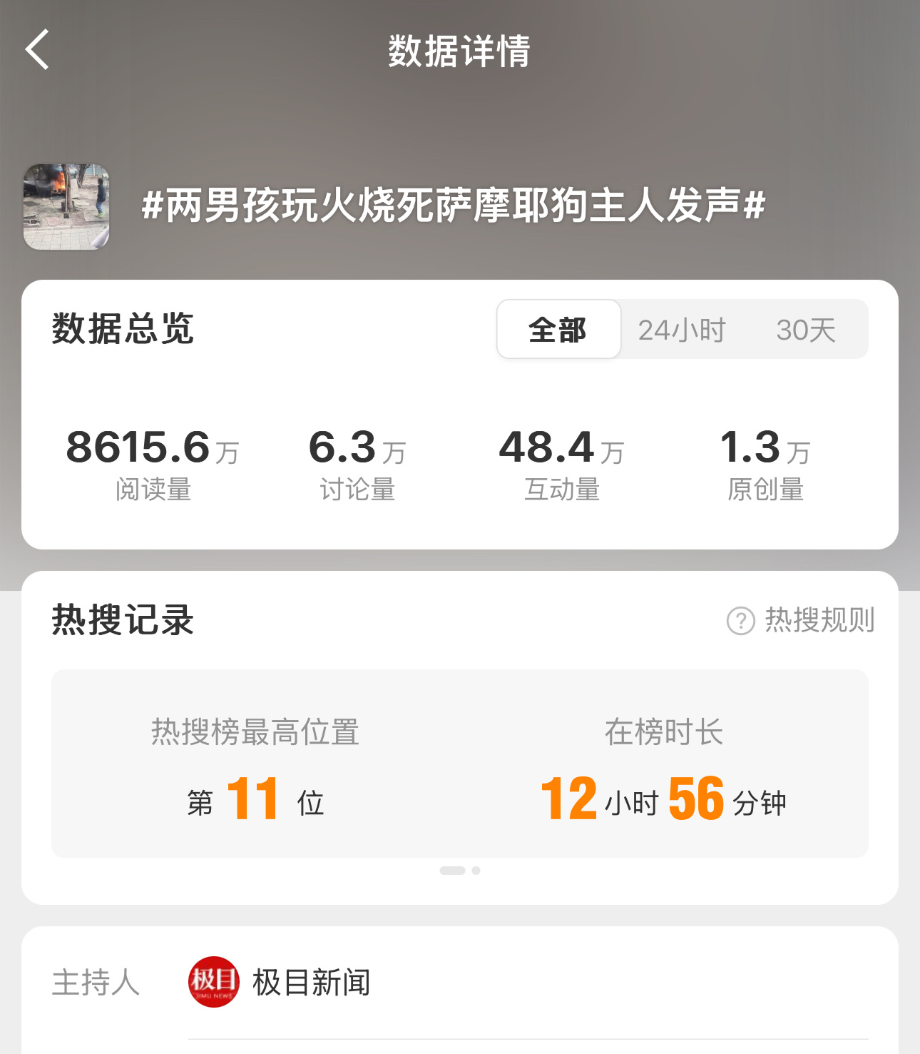 萨摩耶被两个小孩玩火意外烧死媒体做了9个以上的热搜不断的引导公众情绪博取流量