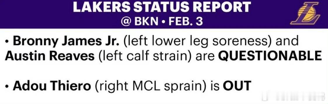 湖人这边——布朗尼(左腿酸痛)、里夫斯(左腿小腿拉伤)出战成疑!蒂耶罗(右膝内侧副韧带扭伤)明日缺席!