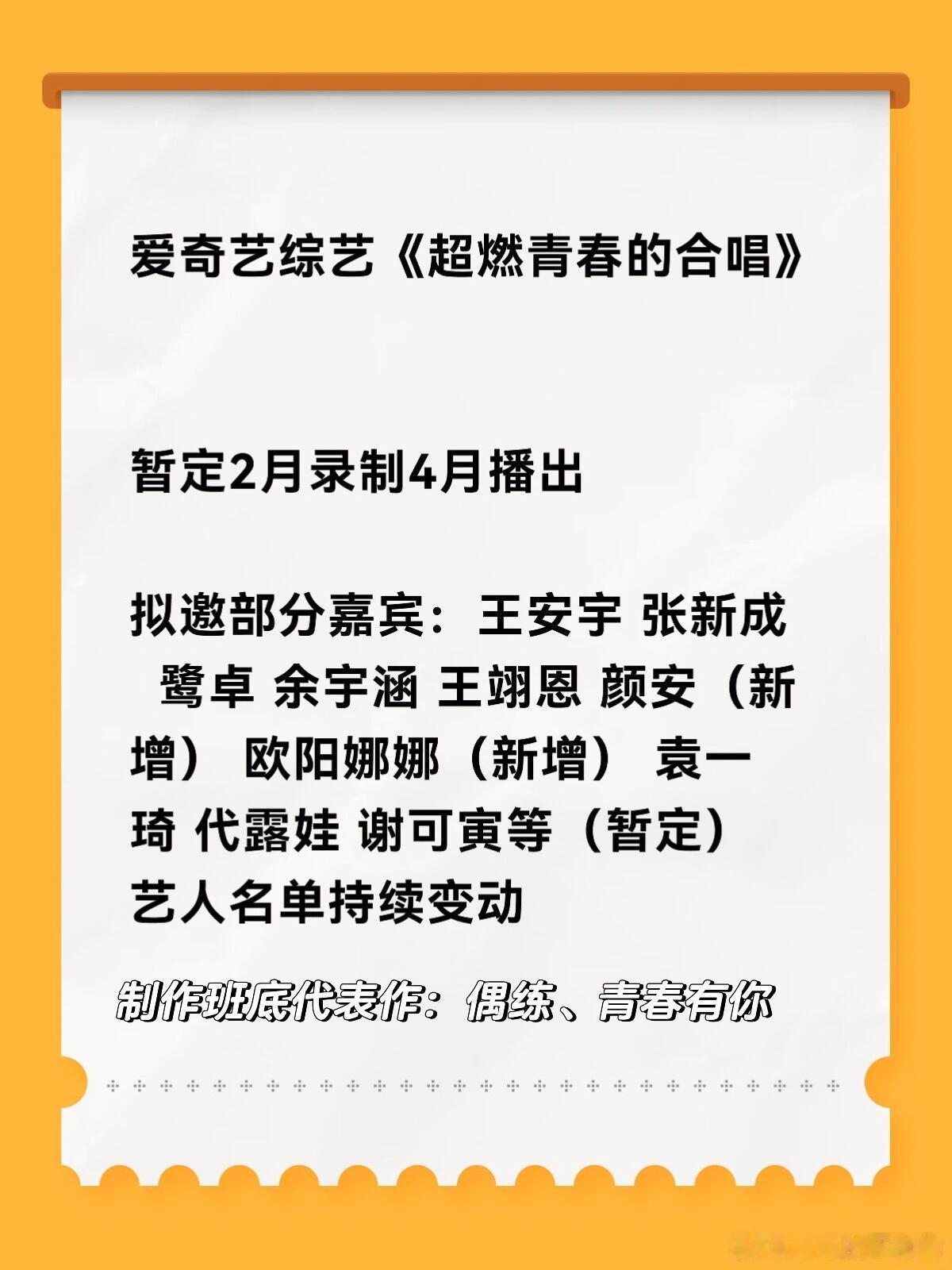 爱奇艺综艺《超燃青春的合唱》 艺人更新爱奇艺综艺《超燃青春的合唱》暂定2月录制4月播出拟邀部分嘉宾:王安宇 张新成 鹭卓 余宇涵 王翊恩 颜安(新增) 欧阳娜娜(新增) 袁一琦 代露娃 谢可寅等(暂定)艺人名单持续变动制作班底代表作:偶练、青春有你简介:30-各行业青春焦点人物,50天合宿训练,PK国外顶级合唱团,竞演淘汰择优成团,打造闪耀的合唱新星。