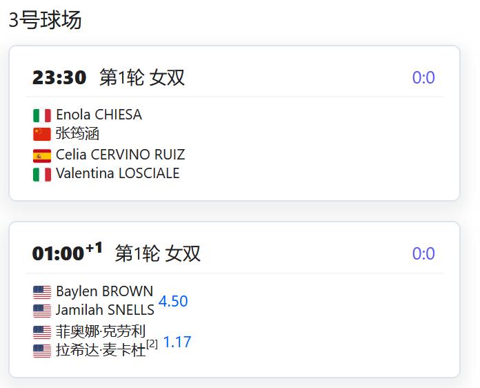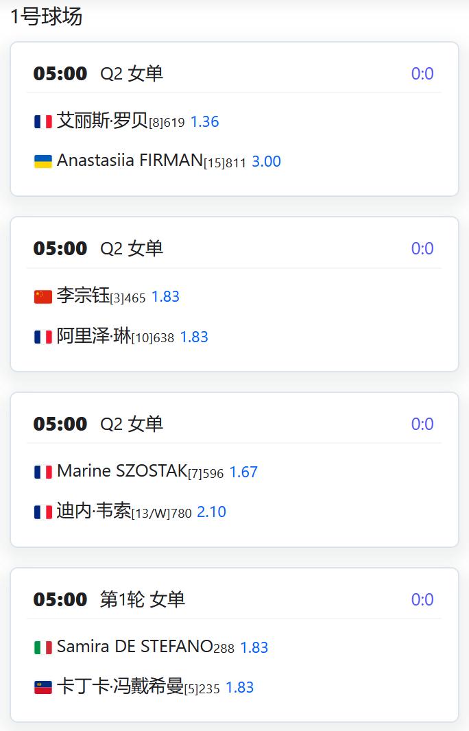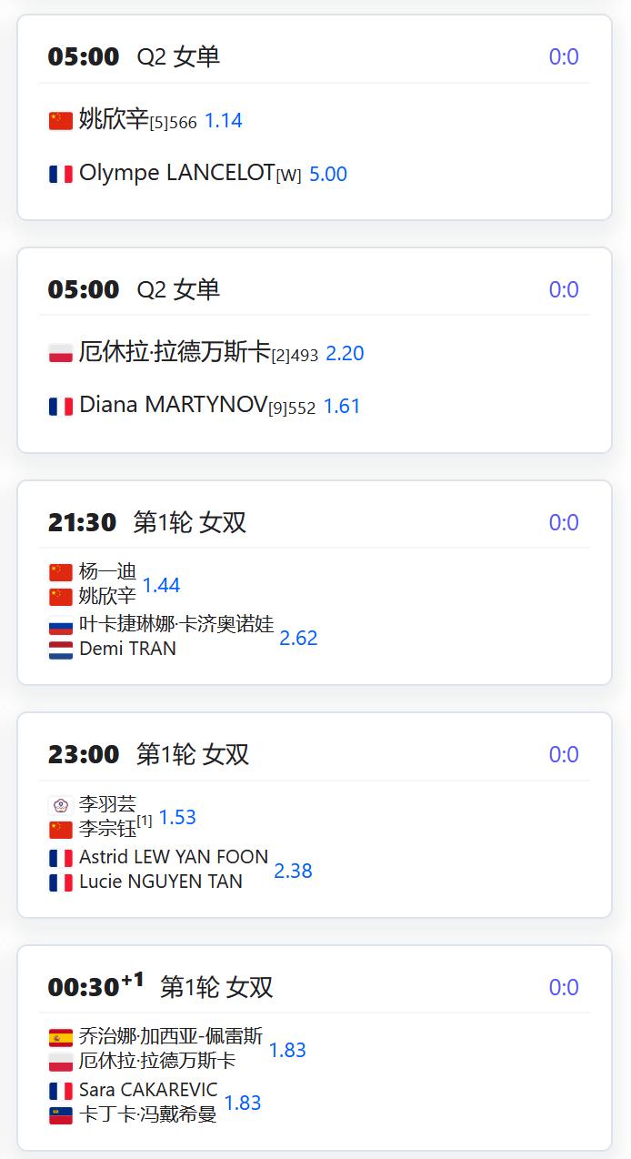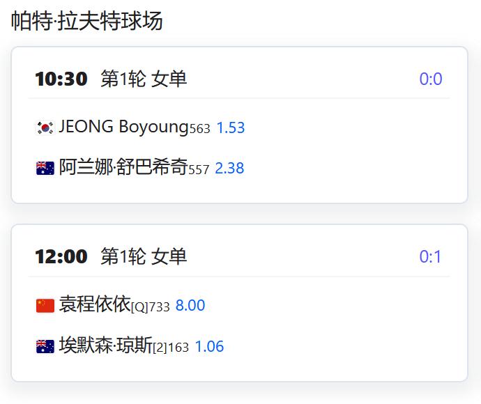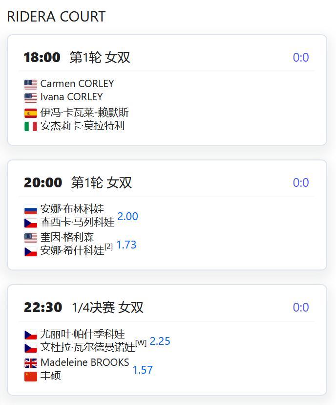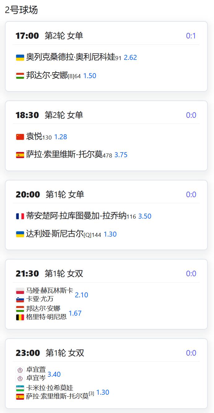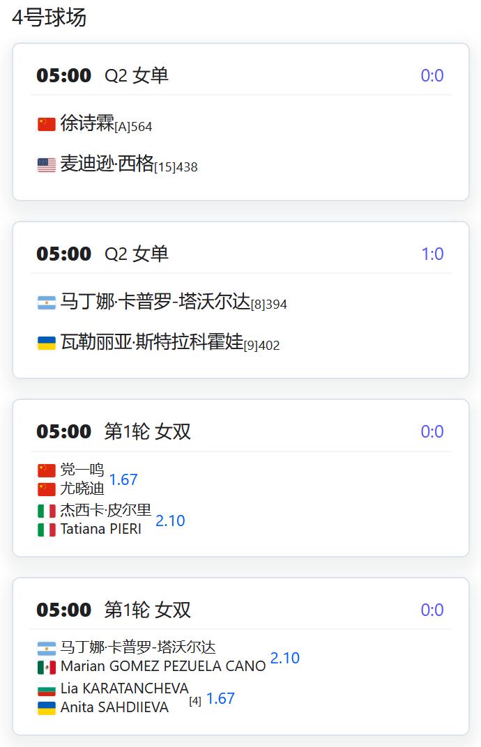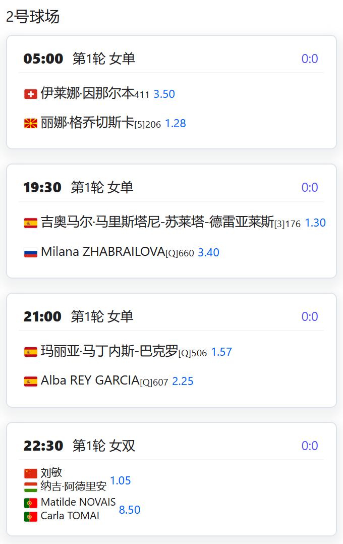WTA500赛阿布扎比站,女双第一轮,徐一璠搭档萨姆索诺娃将对阵奥斯塔彭科/克赖奇科娃的大满贯冠军组合; WTA250赛俄斯特拉发站,女双四分之一决赛,丰硕组合将对阵本土外卡帕什季科娃/瓦尔德曼诺娃; WTA250赛克卢日纳波卡站,女单第一轮,王欣瑜将对阵资格赛球员克韦多; 女单第二轮,袁悦将对阵西班牙的托尔莫; W125孟买,女单第一轮,田方然将对阵日本的西乡里奈; CH75布里斯班,男单第一轮,孙发京将对阵西班牙的桑切斯; W75布里斯班,女单第一轮,从资格赛突围的袁程依依将对阵2号种子琼斯; W75昂德雷济约-布泰翁,女单资格赛第二轮,李宗钰将与10号种子阿里泽·琳争夺一个正赛席位; 姚欣辛将与本土外卡争夺一个正赛席位; 女双第一轮,杨一迪/姚欣辛将对阵卡济奥诺娃/TRAN; 李宗钰/李羽芸将对阵一对法国本土组合; W50奥兰多,韩江雪将与小池爱菜争夺一个正赛席位; 徐诗霖将与15号种子西格争夺一个正赛席位; 女双第一轮,党一鸣/尤晓迪将对阵意大利组合皮尔里姐妹; W50波尔图,刘敏搭档匈牙利的阿德里安对阵一对葡萄牙组合; 张筠涵搭档意大利的切撒对阵一对意西组合。