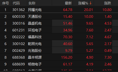 上证报中国证券网讯2月3日早盘,LED概念股震荡走高,截至9时51分,民爆光电20cm涨停,走出2连板,天通股份涨停,晶盛机电涨近10%,环旭电子、福晶科技涨超7%,乾照光电等跟涨。
