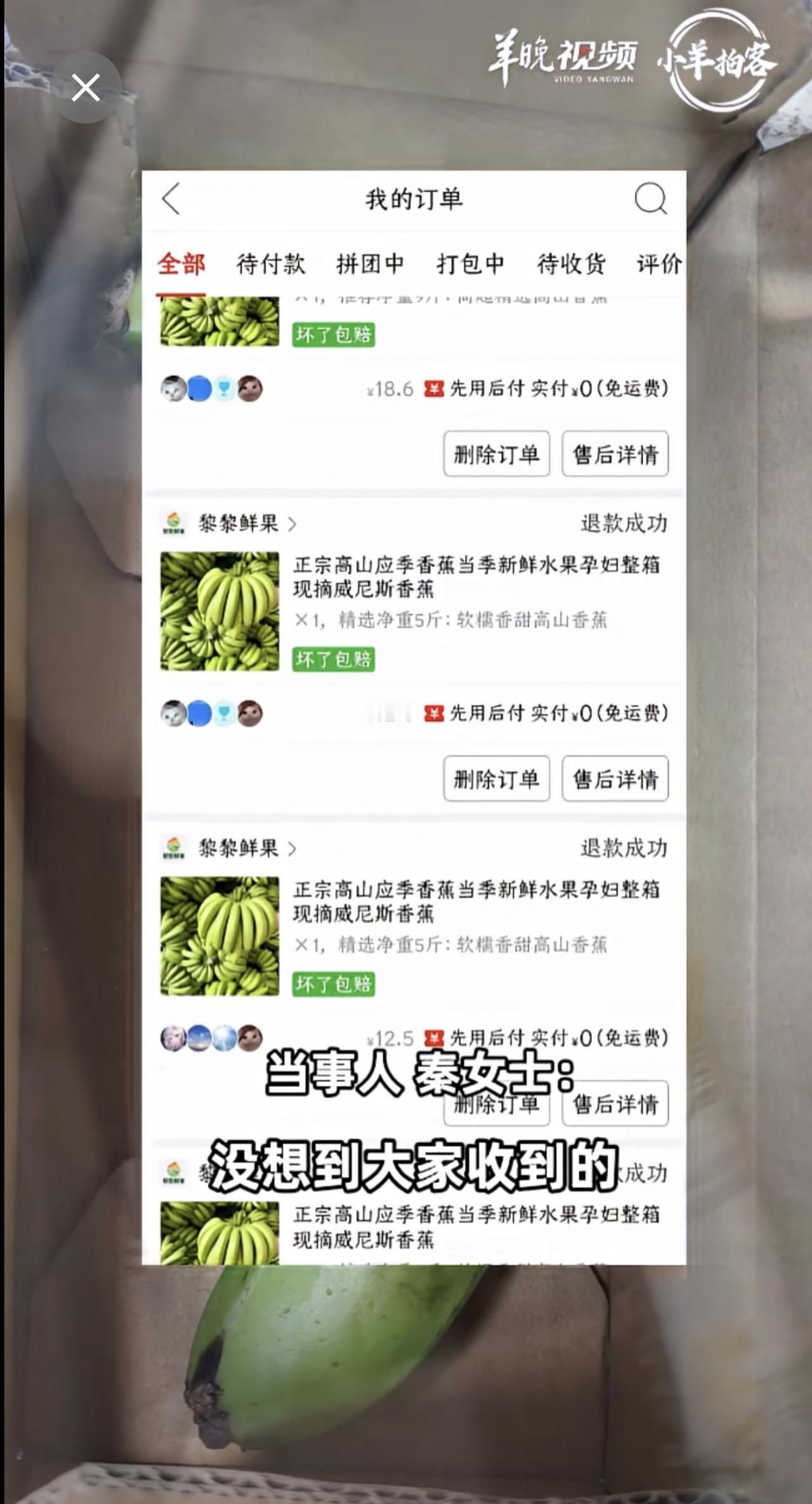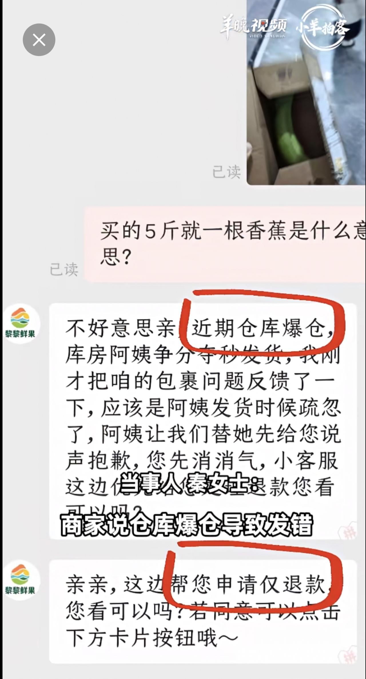 好尴尬!女子买9斤香蕉到货仅1根,还买了3单送亲戚全中招。平台:将处罚有违规行为的商家。来源:小羊拍客 @不烫死猪 ([原创]记者:杨楚滢;实习生:王咏心;编辑:林润祺;审签:周乐瑞)