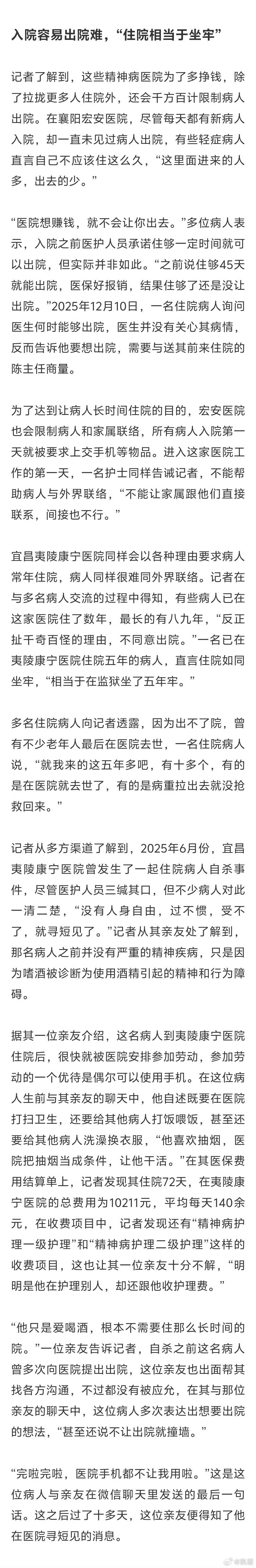 一名护工告诉记者,襄阳一些精神病医院每天也是按照这个数额从医保套取资金,因而住院的病人越多,医院就越赚钱,“一个月一个人套五千,一年六万,一百个病人就是六百万,成本一年就赚回来了。”