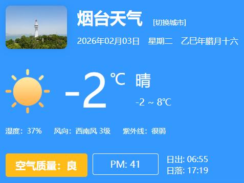 2月3日烟台天气:晴-2~8℃西南风3级