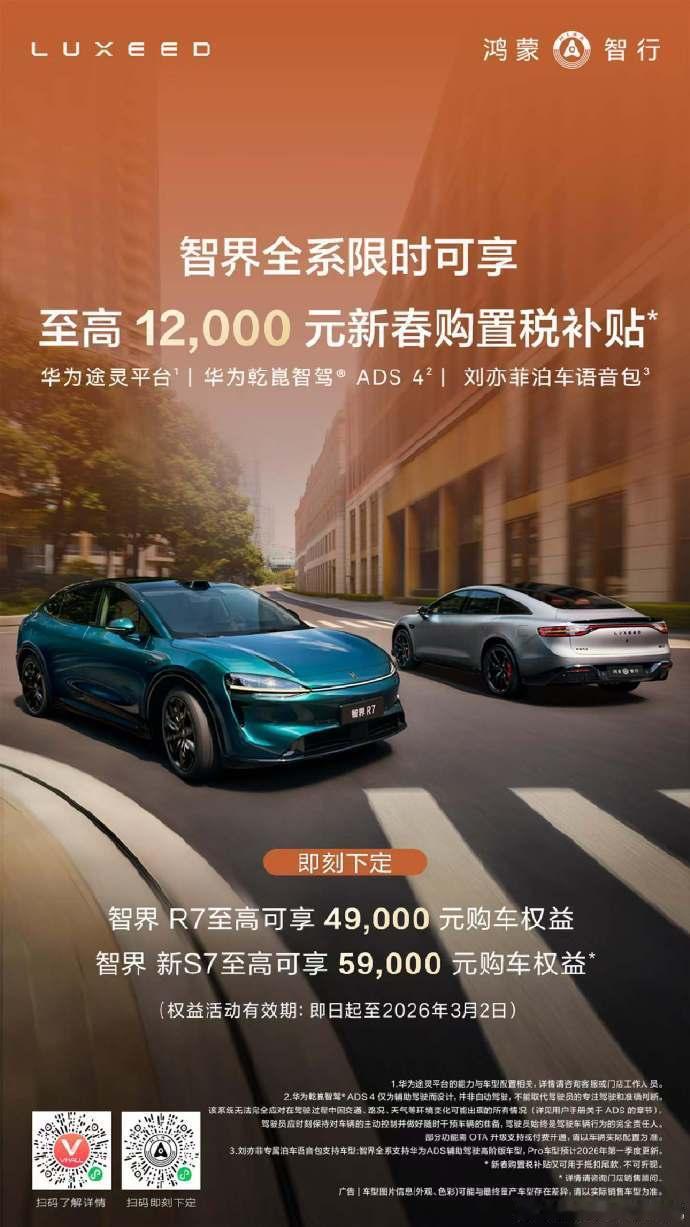 2月鸿蒙智行购车部分优惠来了!智界继续延续上个月的12000元购置税补贴尚界2月