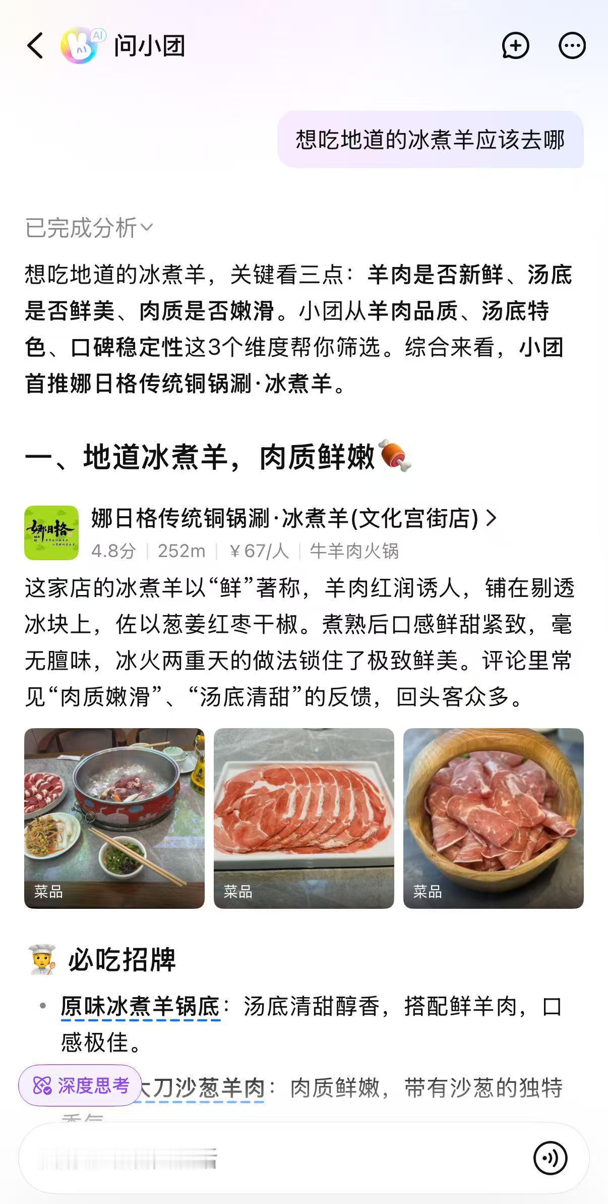 临近年关,约上朋友去外面搓一顿,出门的时候发现街边好多小店都张贴了“春节营业公告”,仔细一看和往常的公告还有所不同,不管这些商家春节营业还是不营业都安排我们上美团AI搜索“问小团”!正好准备大年初一去吃那家铁锅炖聚聚,然后大年初二再去吃那家冰煮羊!你别说还挺贴心,像这过年期间,商家作息不定,但我们的吃喝玩乐需求可没“假期”!亲测,不管是突然想买年花、找还在营业的超市,还是琢磨带家人去哪逛逛,用美团AI搜索“问小团”都能快速给出靠谱答案。可以说,它就像一张随时在线的春节生活保底牌,安心!生活问题问美团都安排 这个春节,让“问小团”接住你所有临时起意的小问题吧~