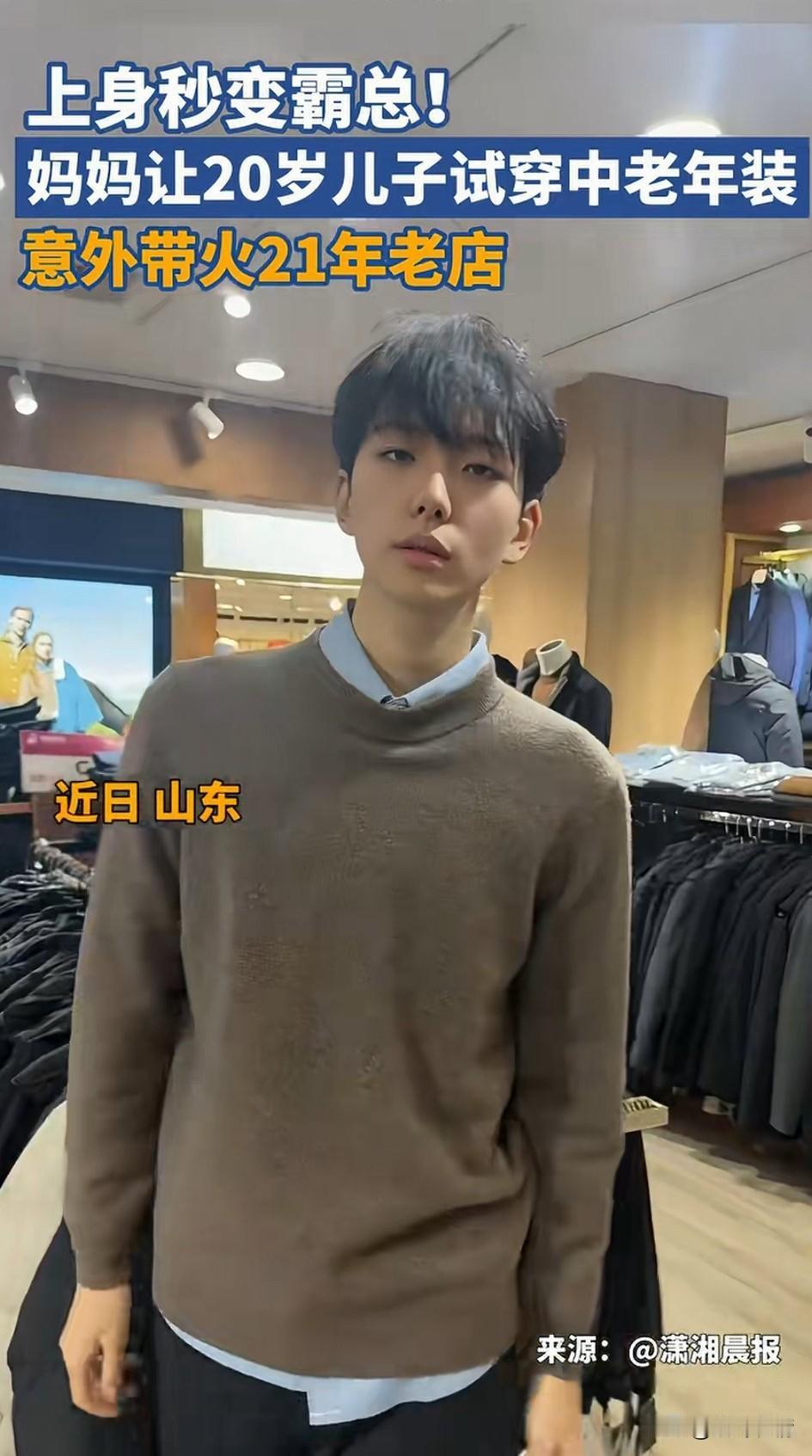 近日山东一家老店火了, 店主的帅气儿子直接秒变霸总, 原来他妈妈开着一家中老年服装店, 生意一直不晕不火, 儿子放假回家之后, 老妈让儿子试穿店里的衣服, 并且让他充当模特拍照, 事后将这视频上传到网络, 迅速引起了网友的关注, 儿子,身高188, 长得确实非常帅气, 直接将这家店带火, 不过他的妈妈说对生意毫无用处, 因为来这家店逛的都是一些年轻女性, 说白了都是冲着他帅气的儿子来的, 她的儿子目前没有女朋友, 这一定是在暗示些什么? 因此吸引了很多年轻女性前来, 不过他也提醒大家, 儿子3月份就要开学了, 想来看霸总的要抓紧时间了, 在妈妈的眼中没有对金钱的渴望, 全是对儿子没有女朋友的担忧! 大家觉得山东服装店老板的儿子帅吗? 山东 霸总 女老板 帅儿子