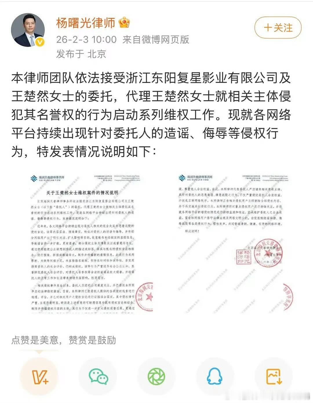 王楚然告嘿,出道以来首次支持维权