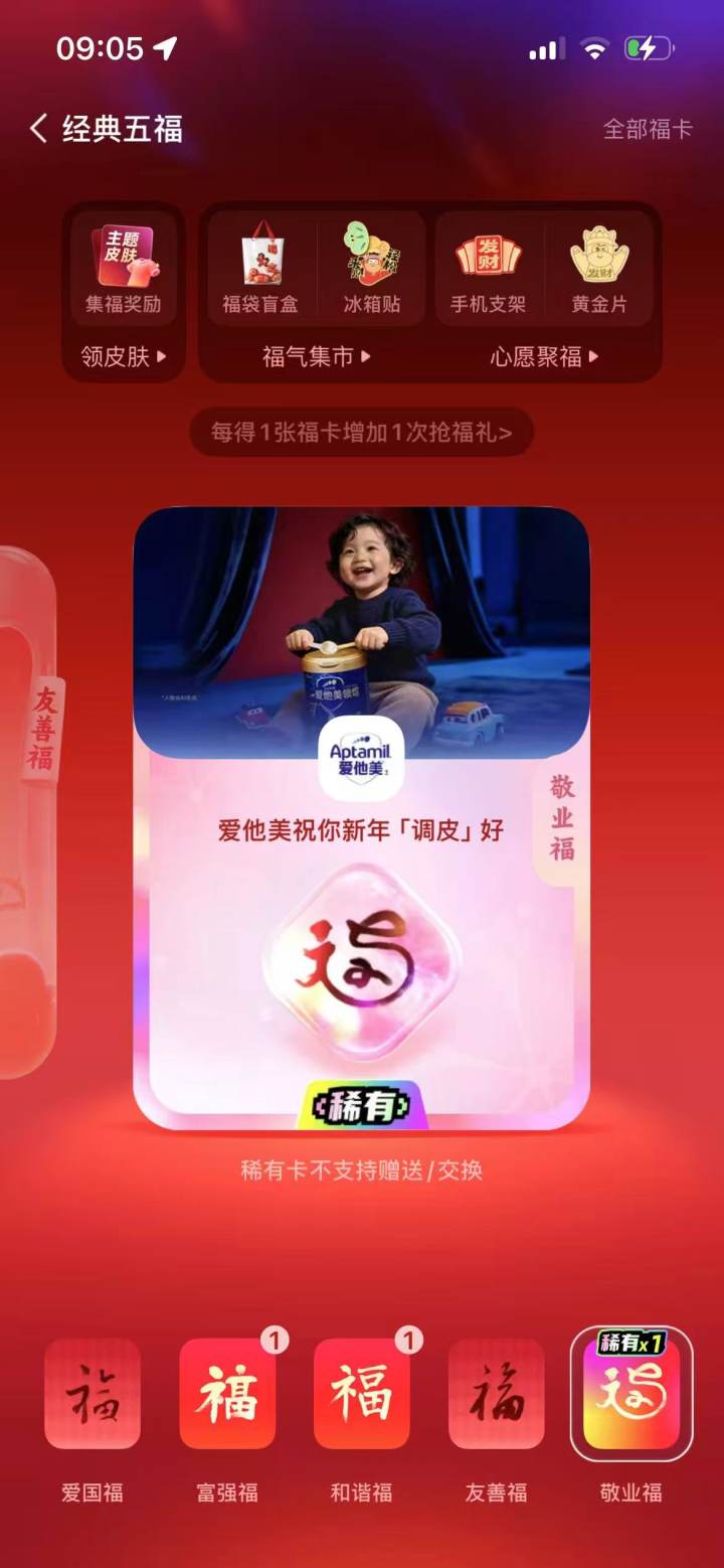 说起来,支付宝集福活动自2016年推出,至今已连续举办11年,累计参与超10亿人次。今年支付宝集福活动共推出19套主题福卡,涵盖经典五福与游戏、潮玩、影视等多领域IP,用户可任选6套主题福卡来集,每集齐一套即可锁定1.68元红包。