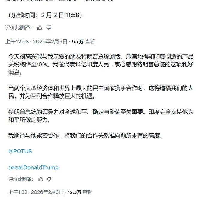 2月3日,美国总统特朗普与印度总理莫迪刚刚进行了通话,印度争取到将关税从25%降至18%,但付出的巨大妥协却是令人咋舌的,尤其是承诺停止进口俄罗斯石油。那么特朗普与莫迪到底谈了一些什么?莫迪又为何会突然做出这么大的妥协呢? 先把通话的核心干货摆清楚,当地时间2月2日上午,特朗普主动和莫迪通了电话。两人全程围绕贸易和能源两大块谈,最终敲定了一份双边协议。 特朗普在社交媒体上直接晒了谈判结果。美国会把对印度输美商品加征的“对等关税”,从25%降到18%,而且这份调整立即生效。紧接着,特朗普还明确,会完全取消之前为逼印度停购俄油而额外加征的25%关税。 印度这边也得拿出对等交换。莫迪承诺,印度会同步降低对美国的关税和非关税壁垒,最终目标是降到零。莫迪还拍板,要大幅增加对美国产品的采购,清单里包含能源、技术、农产品、煤炭等,总价值要超过5000亿美元。 最让人意外的让步在能源领域。莫迪明确同意印度停止购买俄罗斯石油。不仅如此,印度还会转而从美国采购更多石油,甚至可能考虑从委内瑞拉进口石油填补缺口。 莫迪当天也在社交媒体上发了文。他没提停购俄油的妥协,只重点感谢了特朗普同意降低关税,字里行间都在弱化自己的让步幅度。 很多人都懵了,莫迪为啥突然服软?背后核心原因其实很现实,全是利益权衡后的无奈选择。 俄油对印度的吸引力早已大不如前。此前俄罗斯为了抢占印度市场,给印度的原油每桶能让利14到16美元。靠着这份大额折扣,印度的炼油厂低价进货、高价出售,赚得盆满钵满。但到了2026年初,这份折扣大幅缩水,只剩每桶2.5到4美元,性价比直接暴跌。 美国的关税大棒始终悬在印度头顶。去年7月,美国就对印度输美商品加征25%关税。8月又追加了25%关税,理由就是印度持续进口俄油。特朗普还放了狠话,要是印度不配合,关税会直接加码到50%甚至100%。 这个威胁对印度来说,根本承受不起。美国是印度最大的出口目的国,占印度货物出口总额的20%。2024年,印度对美出口额达870亿美元,占其GDP的2.3%。一旦关税翻倍,印度年度出口收入可能直接减少200到300亿美元,GDP增速也会被拖累0.3%到0.4%。 印度的支柱产业更离不开美国市场。医药、智能手机、珠宝首饰、纺织服装这些印度的核心出口品类,对美出口占比都在30%到40%之间。这些行业吸纳了印度大量就业,要是被美国关税卡死,印度国内就业市场会直接崩盘。 更要命的是外资流失压力。美国资本占印度外国投资的三分之一。去年7月,就因为关税冲突,外国投资者从印度股市撤出了超过20亿美元。要是和美国彻底谈崩,后续外资撤离的规模只会更大。 其实印度早就开始悄悄调整了。今年1月,印度国有炼油厂就接到了暂停采购俄油的指令,不仅不签新订单,还拒绝俄油轮靠岸。俄罗斯对印原油出口量,从之前的日均180万桶,直接跌到110万桶,去年12月单月跌幅就达29%。 对莫迪来说,这次妥协是两害相权取其轻。一边是折扣缩水、没了利润的俄油,一边是关乎经济命脉和就业的美国市场。放弃俄油,换来了关税下降和美国市场的稳定,在他看来是不得不做的选择。 特朗普这边也有自己的算盘。拉拢印度停购俄油,能进一步打压俄罗斯的能源收入。同时,靠着关税让步换来了印度5000亿美元的采购订单,既能提振美国本土产业,也能为自己的大选加分。这场通话,本质上是美印双方基于自身利益的一场交易。