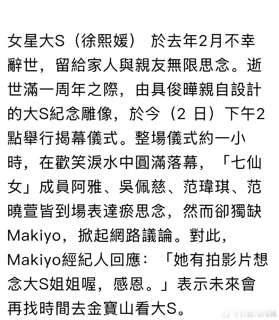 Makiyo回应缺席大s雕像揭幕Makiyo通过经纪人回应缺席大s雕像揭幕,表示“她有拍影片想念大s姐姐喔,感恩”,还表示未来会再找时间去金宝山看大SMakiyo经纪人回应缺席大s雕像揭幕具俊晔穿着27年前大S送的大衣