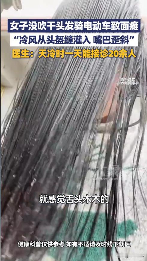 “太可怕了!”近日,河南郑州,一名女子洗完头后没吹干就骑电动车出门,冷风从头盔缝隙灌入面部,没多久她就感觉舌头微微发麻、晚上回家后才发现嘴巴都变歪了,就医后被确诊为面瘫。医生:天冷时一天接诊20余人,别让冷风钻了空子! 冬天洗头后着急出门的小事,但其实这种情况却极易引发意想不到的后果。 据媒体2月2日报道,这名女子洗完头后赶时间,简单擦了擦就戴上头盔出门了。骑车时,她明显感到冷风顺着头盔边缘往脸上钻,舌头好像被吹得麻麻的,但当时并未在意。 晚上回家后,女子对着镜子刷牙,这才发现自己的嘴好像有些歪,用手摸了摸左边的脸,感觉皮肤有些僵硬。意识到不对劲后,她连忙前往医院就诊。 医生检查后诊断为贝尔面瘫,罪魁祸首就是骑行时面部受到的冷风刺激。医生解释,湿发状态下头部毛孔张开,冷风会直接侵袭面部神经,导致神经水肿、功能障碍,进而引发面瘫。 医生表示,近期气温骤降,这类面瘫患者明显增多,高峰期一天能接诊20余人,大多是因为洗头后不吹干、骑车不注意面部保暖导致的。好在经过针灸和药物治疗,这名女子的症状正在逐渐好转,但仍需要持续康复。 因此,冬季洗头后务必吹干头发,骑车时可以佩戴防风面罩或围巾护住面部,避免冷风直接刺激。一旦出现面部麻木、口角歪斜等症状,要及时就医,避免延误治疗。 信息来源:《头发未干骑车出门女子面瘫!虽然装备齐全但风依然透过头盔“吹"进来》都市报道