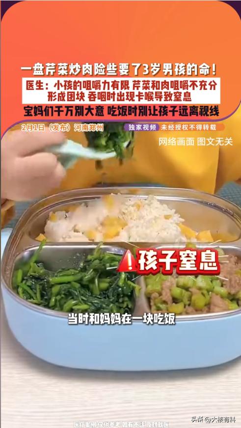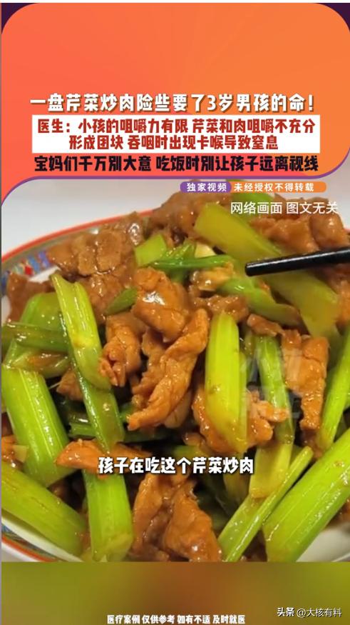 “悲剧还是发生了!”近日,河南郑州,家长在喂一名3岁男孩吃芹菜炒肉后,突然察觉孩子面色发紫、随后就出现呼吸困难的情况,紧急送医后才发现,竟是芹菜和肉形成团块卡住了喉咙,险些造成窒息死亡。网友:带娃吃饭真的不能掉以轻心! 芹菜本身富含膳食纤维,口感偏脆韧,对成年人来说是健康食材,尤其是受到减肥人士的偏爱,但对于咀嚼能力较弱的幼童来说却暗藏风险。 据媒体2月1日报道,这天中午,家人像往常一样给准备了芹菜炒肉,看着孩子吃得香,便转身去收拾厨房。可没过几分钟,就听到孩子剧烈的咳嗽声。 孩子母亲赶紧跑来查看,只看见孩子脸色涨得通红、一直张口干呕。吓得慌忙抱起孩子拍背急救,但孩子依然不见好转,甚至脸也开始发紫,于是家人立刻送往医院。 送到急诊时,孩子已经出现缺氧昏迷的症状,医生紧急用喉镜取出了卡在气管里的芹菜肉团,经过半小时的抢救才脱离危险。 医生表示,小孩的咀嚼能力较弱,芹菜纤维粗、肉质偏韧,混合后容易形成紧实的团块,一旦误吸就会堵塞气道,短短几分钟就可能引发窒息。 专家提醒,儿童气道狭窄,异物卡喉是常见的意外伤害,家长要掌握海姆立克急救法,一旦发现孩子出现呛咳、呼吸困难,第一时间施救并送医。同时,给孩子准备食物时,要根据年龄和咀嚼能力调整食材形态进行选择。 信息来源:《第91集:2月1日(发布),河南郑州,一盘芹菜炒肉险些要了3岁男孩的命!医生提醒宝妈们千万别大意,吃饭时别让孩子远离自己的视线。》小莉帮忙