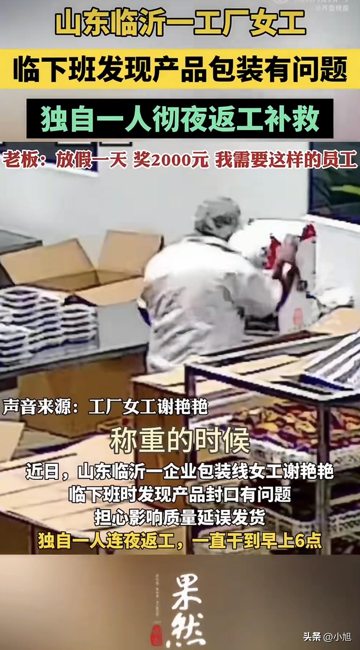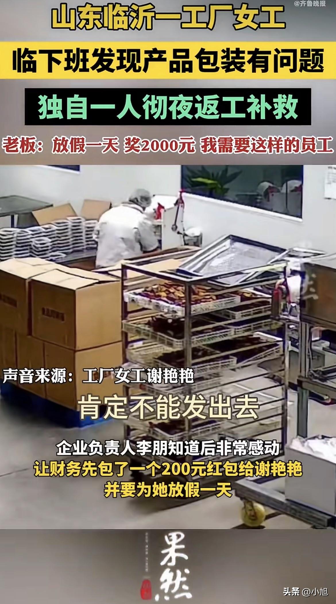 绝了!临下班摸到包装袋手感不对,她一个人通宵干到早晨六点。 山东临沂一家工厂里,女工谢艳艳快下班时觉得手里产品分量轻。一检查,发现包装袋特别容易撕开。原来是机器温度不够,一整批货封口都不严实。第二天就要发货,这问题可不小。 她没犹豫,转身留下。流水线停了,车间就亮着她头顶那盏灯。从晚上到天亮,她一个人把产品重新过了一遍封口机。没人要求,她也没告诉任何人。 天亮后,老板李朋从监控里看到了空荡车间里的一幕。他先是让财务包了二百元红包,还特批一天假。谢艳艳说什么也不收,觉得就是自己该做的,还说“你们当老板的也不容易”。 老板没就此打住。在谢艳艳休假那天,他亲自登门,送上一个两千元的厚厚红包。他话说得实在:我需要你这样的员工,需要这样的精神。 这钱不只是奖励那一夜的辛苦。它买下了多数人下班后不愿多付的那份责任感,奖励了一种近乎“傻气”的担当。在很多人琢磨怎么摸鱼时,她选择了“吃亏”。 通宵返工不是她的义务,但她把产品信誉当成了自己的事。老板的举动也说明了,什么样的行为会被真正看见和重赏。这比任何团建标语都管用。 不是所有付出都有监控作证,但这种不声张的负责,往往是自己最好的背书。事情不大,但那种“活没干好,我心里过不去”的朴素念头,在今天反而显得稀有。 如果是你,会在下班时间默默返工吗?你觉得老板这钱花得值不值?