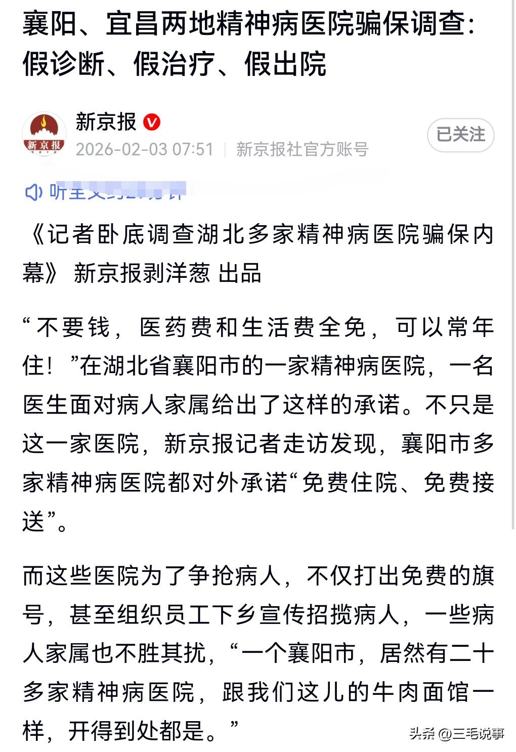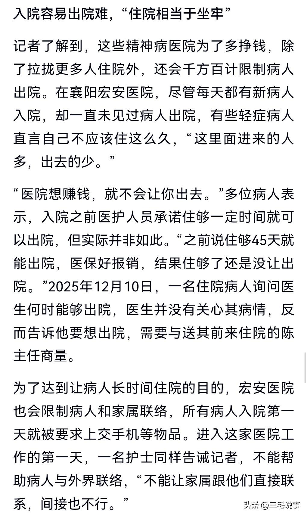 真的是太黑暗了,有些精神病院把那些没有病的关进去,这就是最可怕的地方,简直是泯灭人性啊,严重的犯罪啊,一定要抓起来呀。 2025年12月,卧底调查精神病院,许多病人无异常,有的是被以养老的名义骗进去的。 护工专门欺负那些不听话的病人,那些没病的进去容易出去难,因为医院要骗保,所以不会让那些病人轻易出去。 那里面根本就不能治病,有的进去了,病情更加的严重了。 还有的人由于出不来,最后选择了自杀死了。 这真的是黑暗到了极点,简直是一个魔窟。