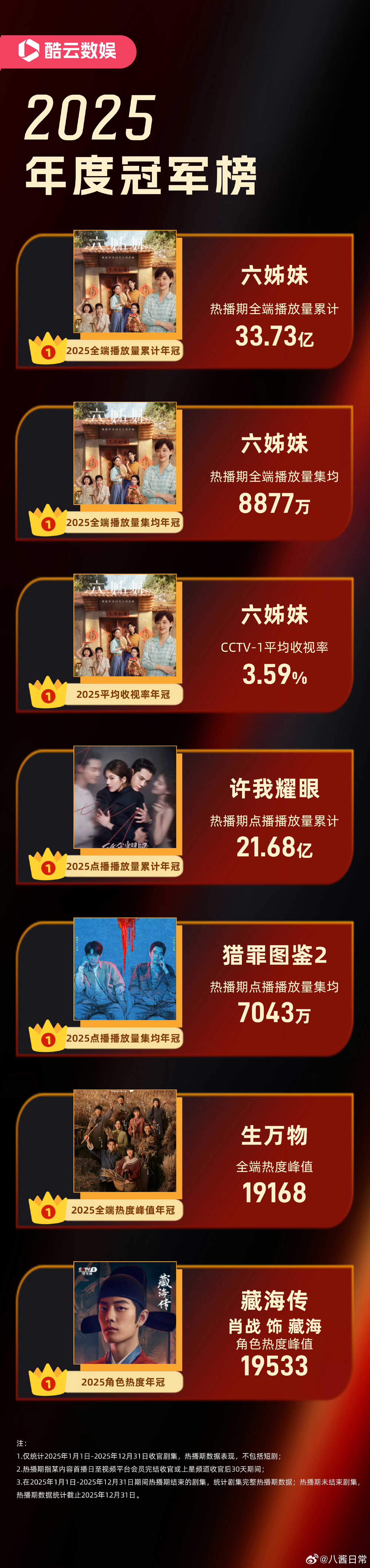 六姊妹开播一周年 电子榨菜清单+1,总收视规模超58.7亿,蝉联央一、东方、山东、安徽四台年冠。腾讯热度29374,年榜17,云合酷云猫眼德塔文全网榜单数据都拿的出手,还横扫了各类年度奖项,妥妥的年度剧王级表现!一年过去了谁还在反复回味何家的日常我不说,再刷亿遍