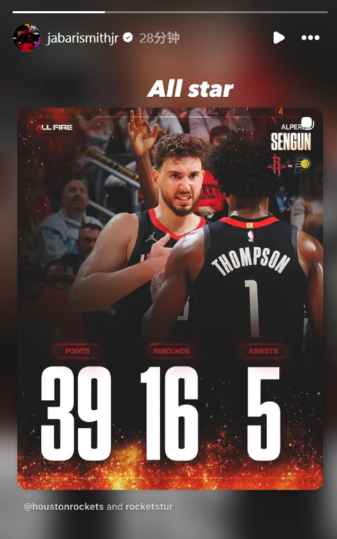 赛后,小贾巴里-史密斯ins晒出申京本场数据海报并配文:全明星。