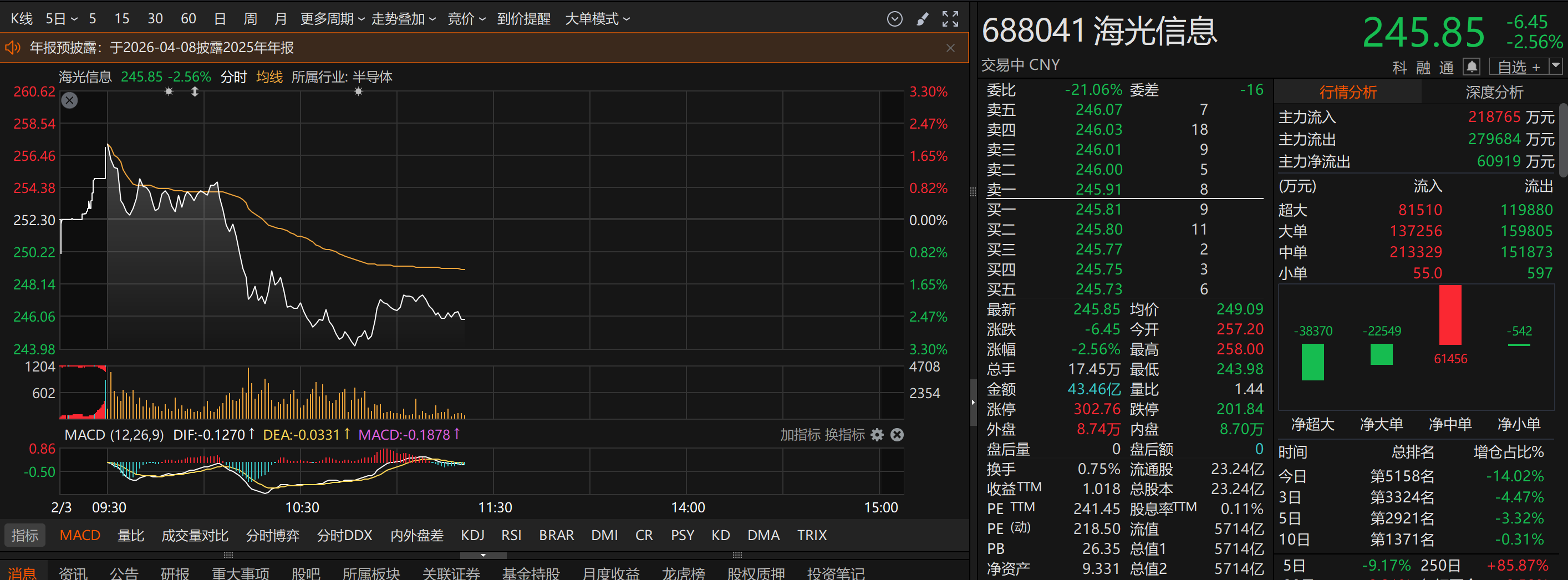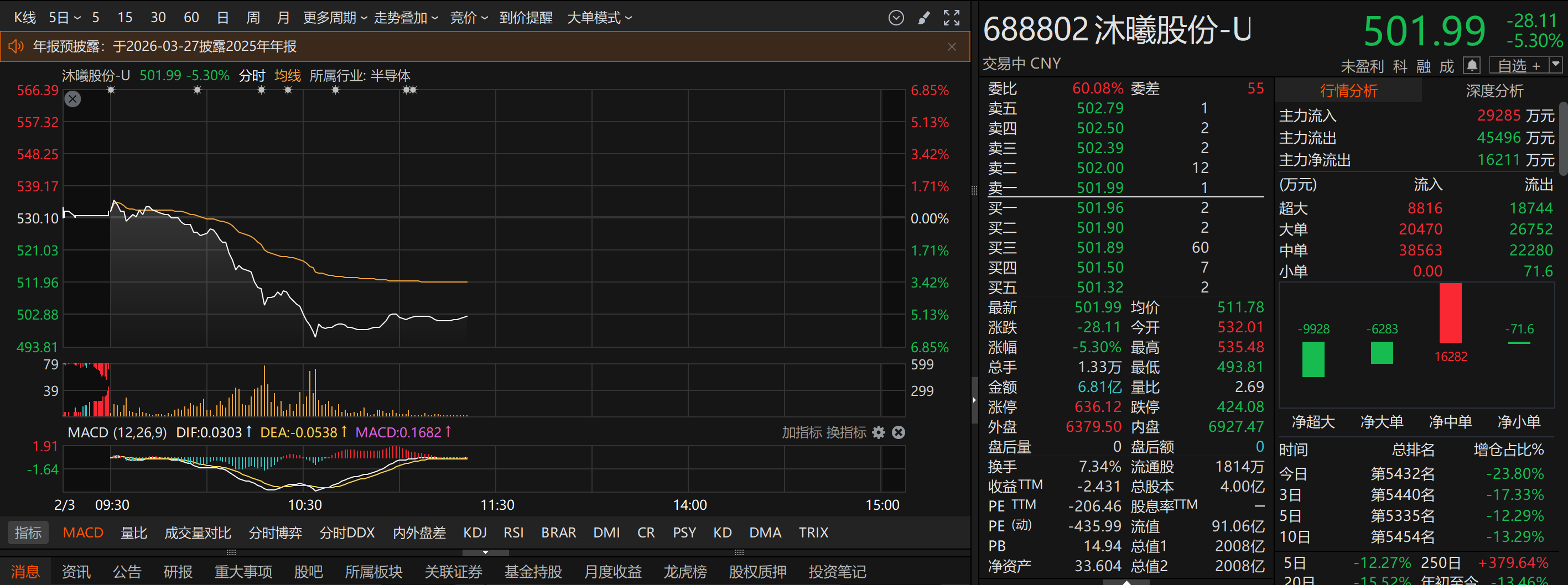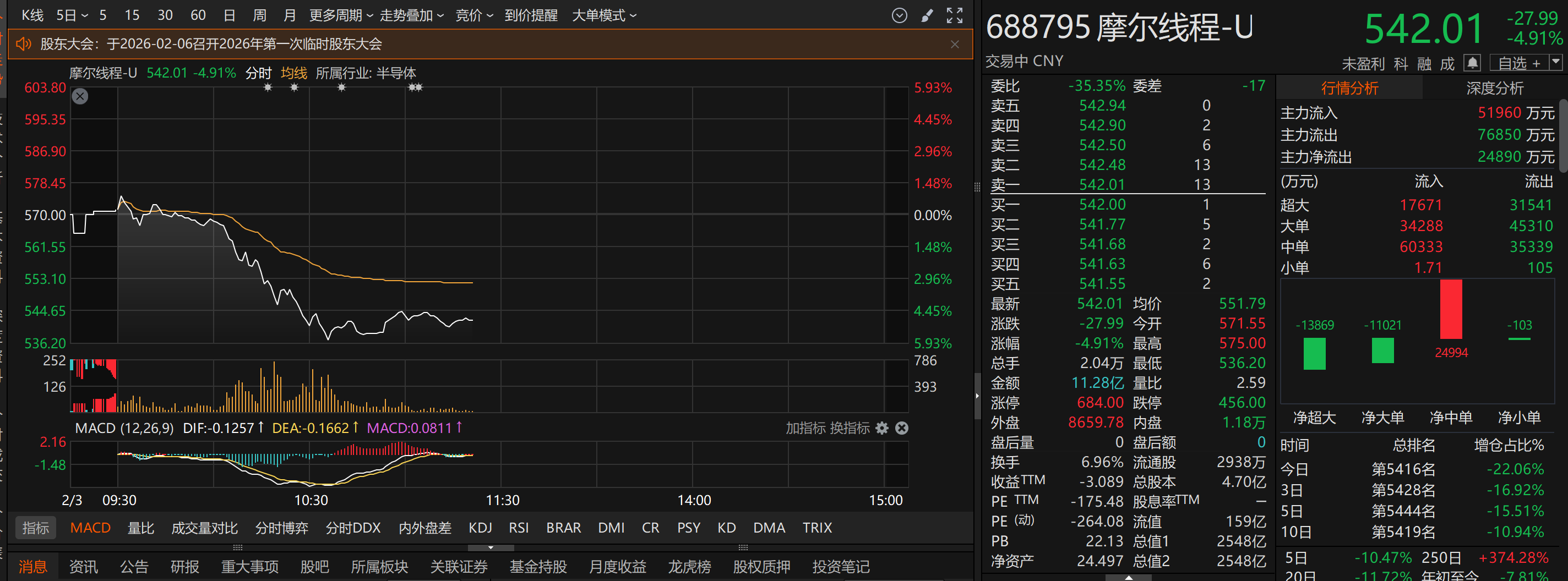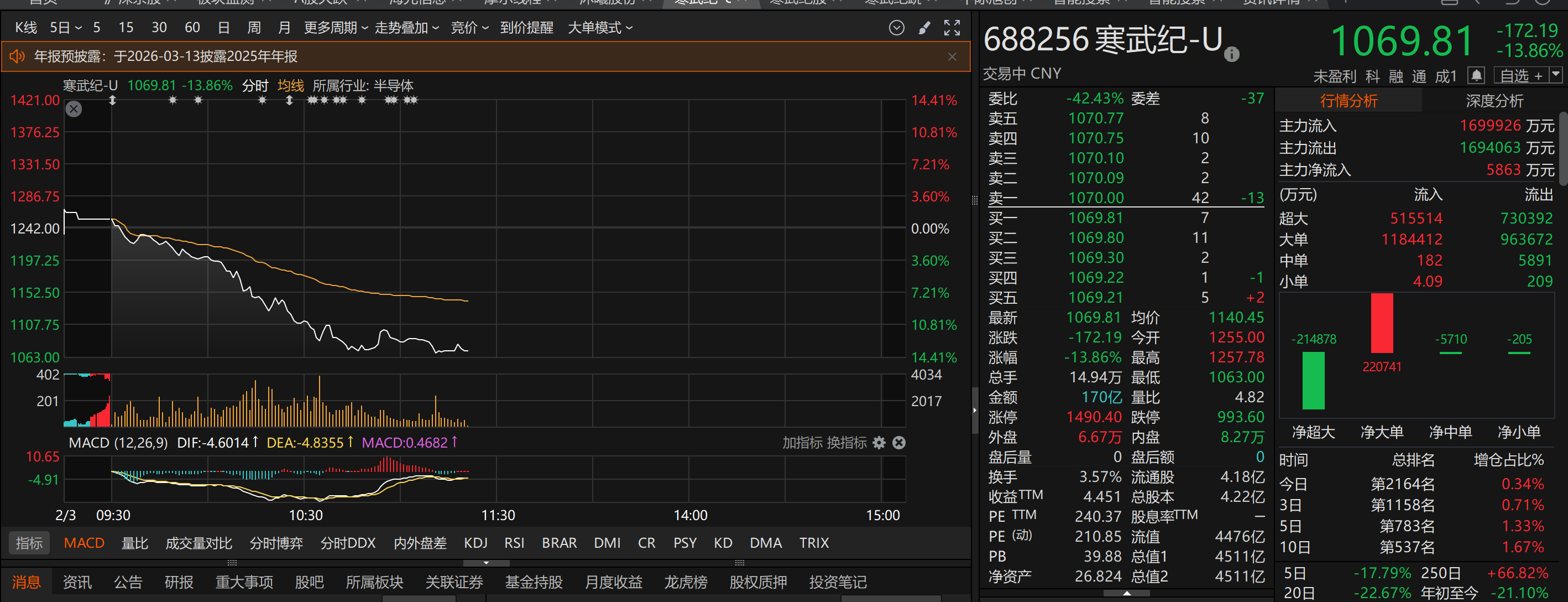 上证报中国证券网讯(记者王玉晴)2月3日早盘,寒武纪持续走低,截至11时20分,跌幅为13.86%,股价报1069.81元/股,总市4511亿元。此外,国产AI芯片板块多股走低,摩尔线程跌4.91%,沐曦股份跌5.30%,海光信息跌2.56%。