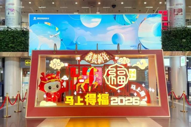 首都机场航站楼内,精心设置的新春景观让节日氛围扑面而来。3号航站楼景观以“天马”为主题,呼应汉代“天马为龙使”的文化内涵,象征连接世界。2号航站楼塑造“日历新篇”景观,融入剪纸风格马年图案与北京剪影,寓意新年启程、时光焕新。在2月10日农历小年当天,首都机场将在2号、3号航站楼开展“首览文华·驰马赴新岁”文化活动。活动设置剪纸、书法、中国结、风车、投壶等非遗项目,通过打卡等多元体验传递新春祝福。
