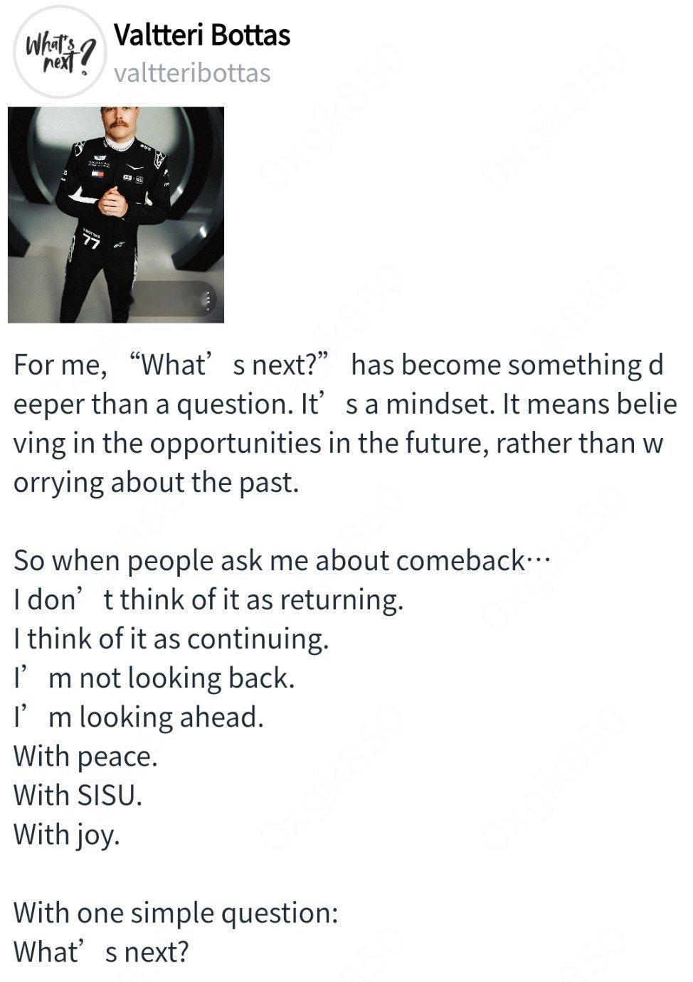 博塔斯对于“What's next?”做出了解答:我不认为这是回归,我认为这是继续,我没有回头看,我再向前看,带着平静,带着状态,带着喜悦,带着一个简单的问题,接下来是什么?F1赛车
