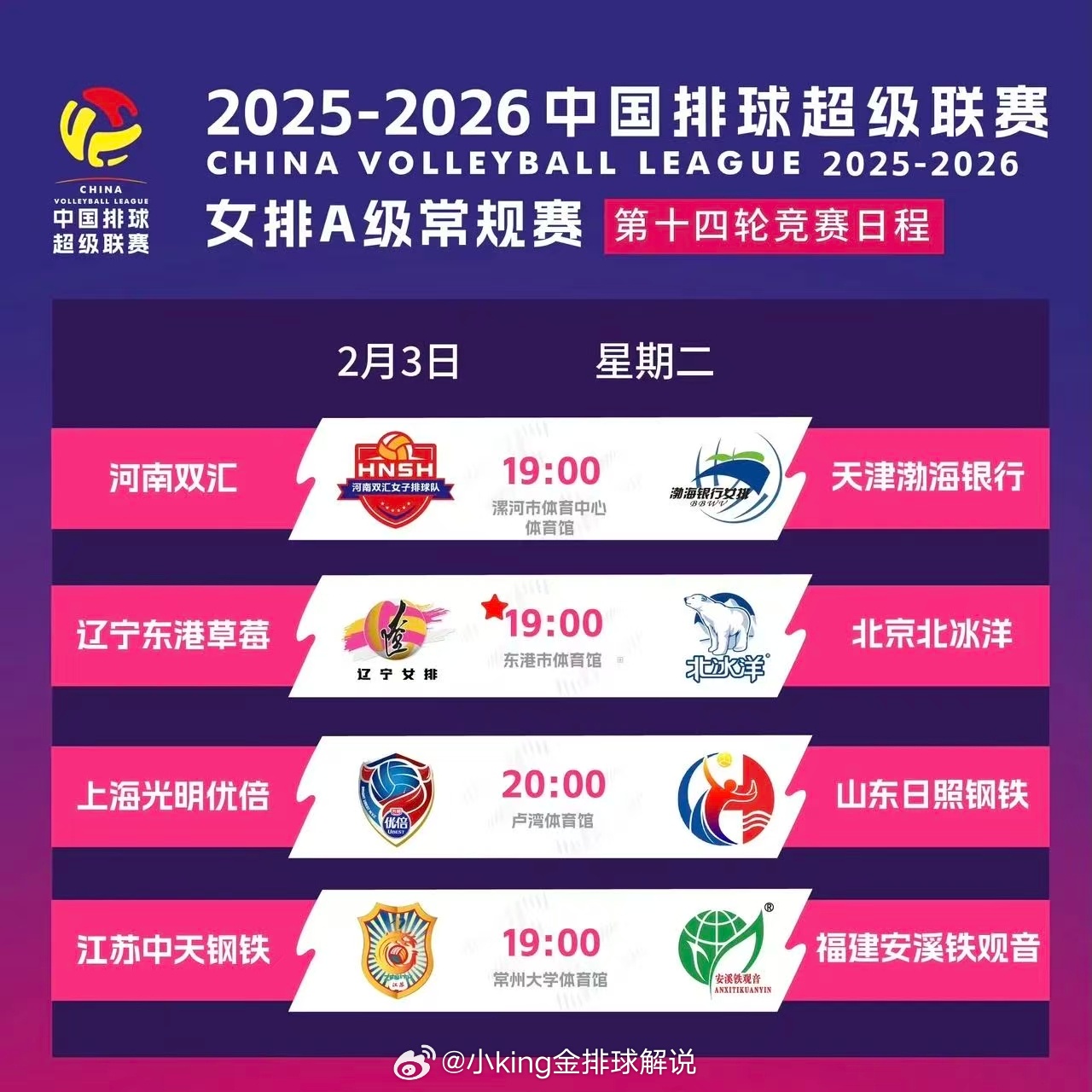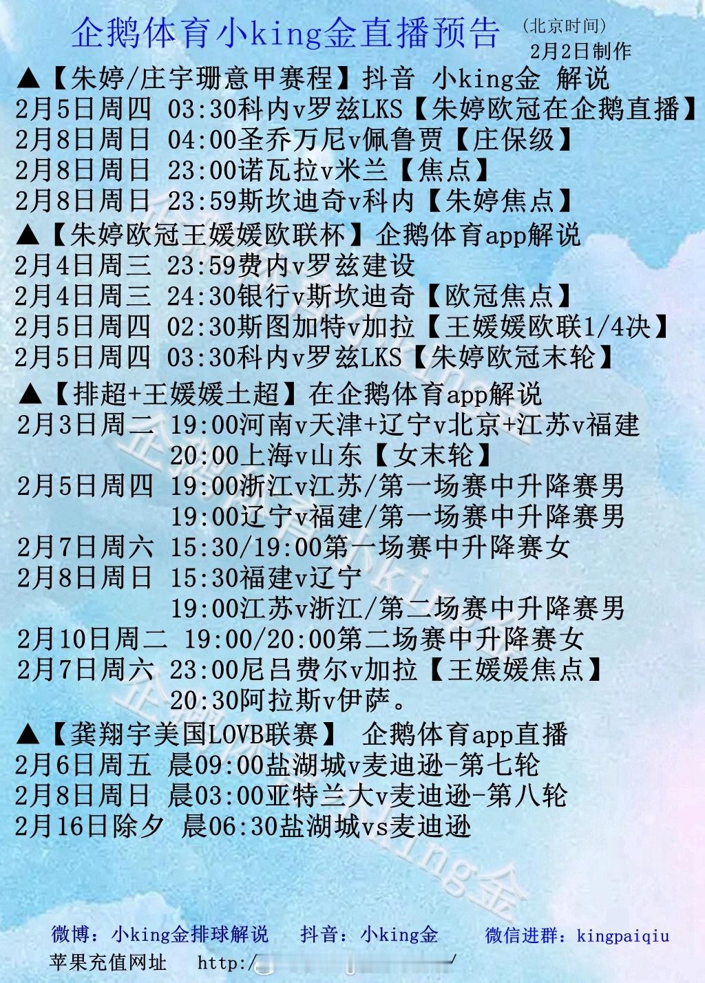 ❤️2月3日周二直播预告:▲【排超 在*企鹅体育app*直播,网页链接】【b级青年】13点天津v上海15点河南v辽宁17点山东v南师大19点福建v江苏⏰ 19:00河南v天津+辽宁v北京+江苏v福建 20:00上海v山东【女A级末轮】今日决出福建和辽宁到底谁去打升降级赛。河南已经确定打。 (加微信kingpaiqiu进群 ,微博:小king金排球解说 看录像和预告,意甲女排在抖音:小king金 直播,企鹅体育app直播其他比赛)图1为本周预告图。中国女排中国女排超级联赛