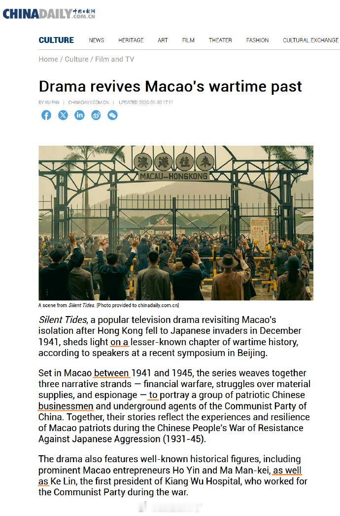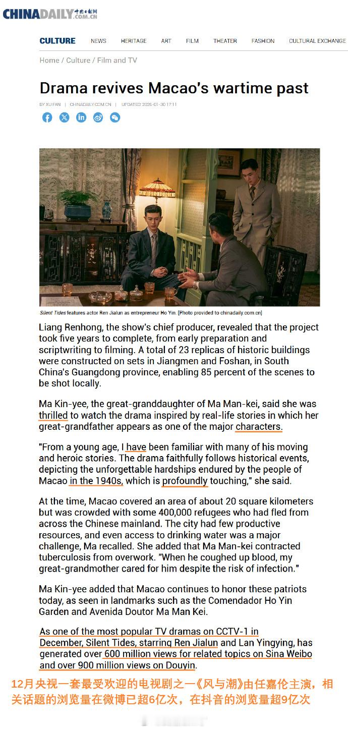 【中国最大英文资讯门户和国家级重点媒体报道任嘉伦风与潮】2026年1月30日,《中国日报》旗下中国日报网于文化版发布全英文专题报道,以“Drama revives Macao's wartime past”为题,深入解读《风与潮》。报道中附上了任嘉伦饰演爱国企业家何贤的精彩剧照,还展示了《风与潮》专题研讨会的现场图!
