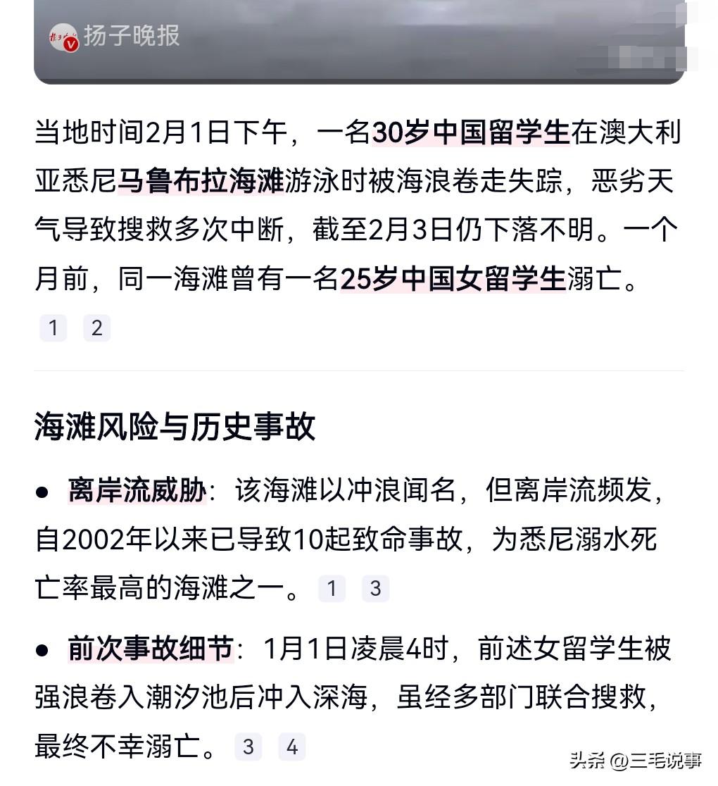 一定要听劝,别在海边游泳了,很危险的。 实在是太悲剧了,当地时间2月1日下午,澳洲夺命海滩又卷走中国留学生,死者才30岁,相当的可惜呀。 一个月前刚有中国女留学生在此溺亡,而且这个地方是悉尼溺水死亡最高的海滩之一。 这么危险,那必须关停才行。 人都要为自己的行为负责,最好的办法就是别在海滩游泳。 跟生命相比,游泳真的很没有必要。