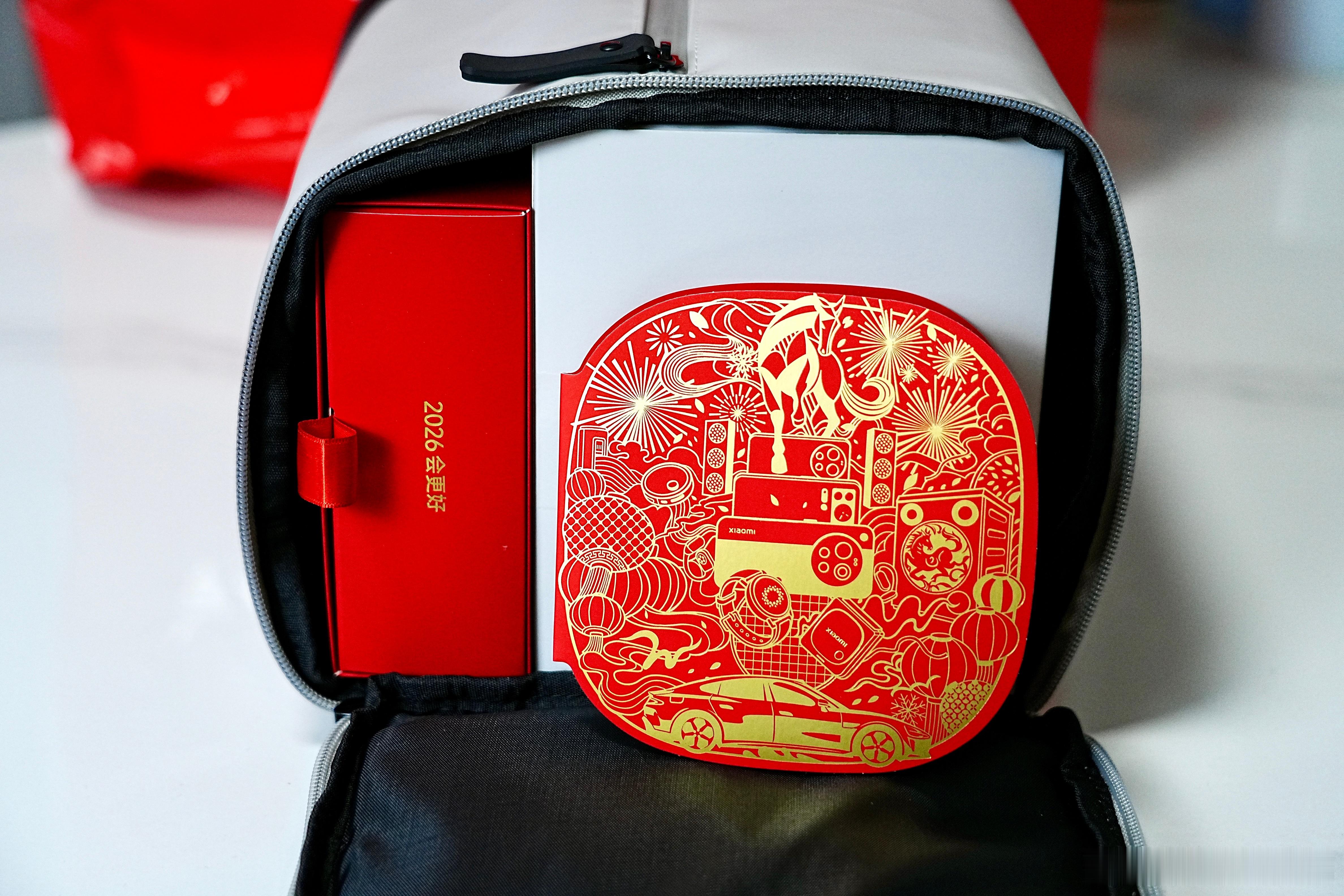 小米收到小米新年礼盒啦,是一个定制侧面可打开的休闲挎包,包里除了定制的红包🧧对联外,居然还有一个我超喜欢的YU7 1:18合金车模,这也太帅了,也希望大家2026一切会更好!
