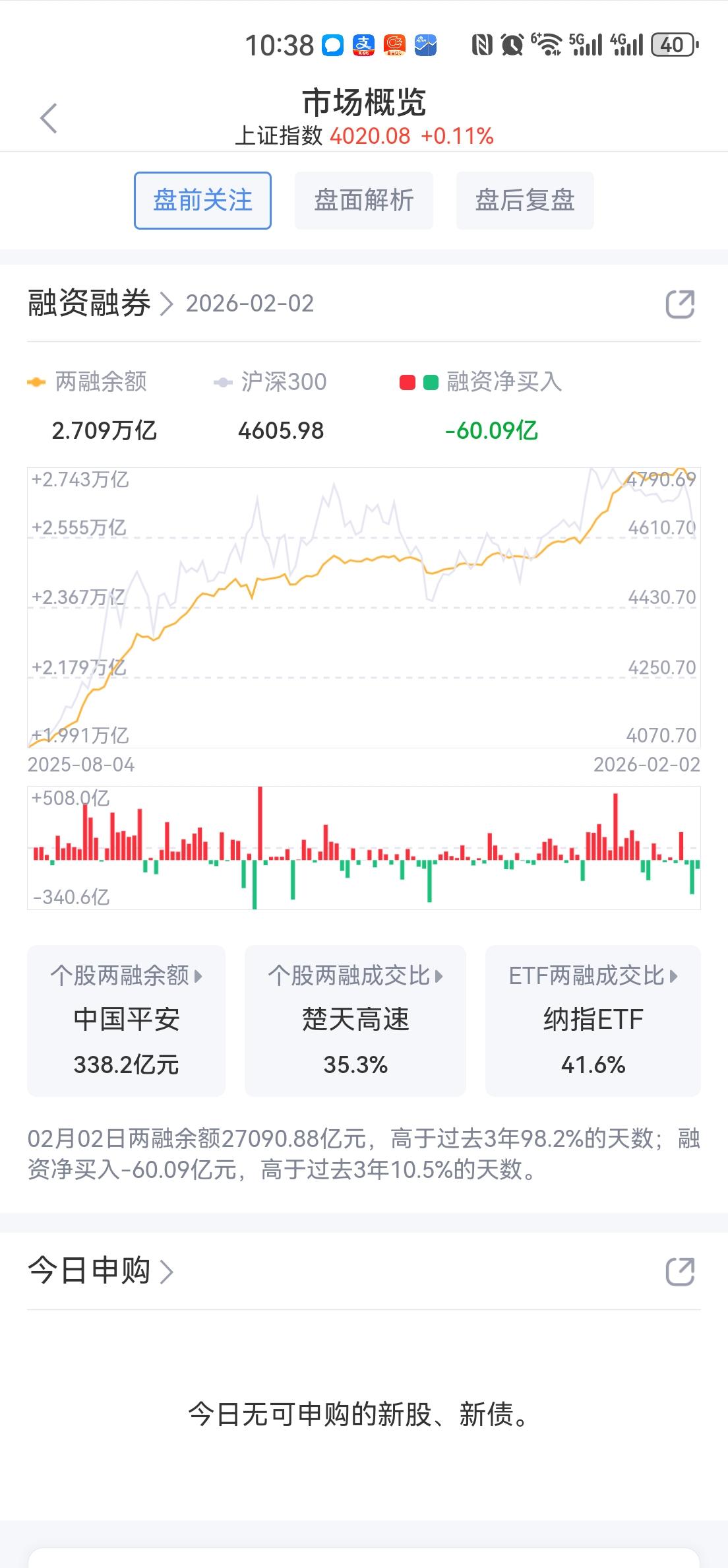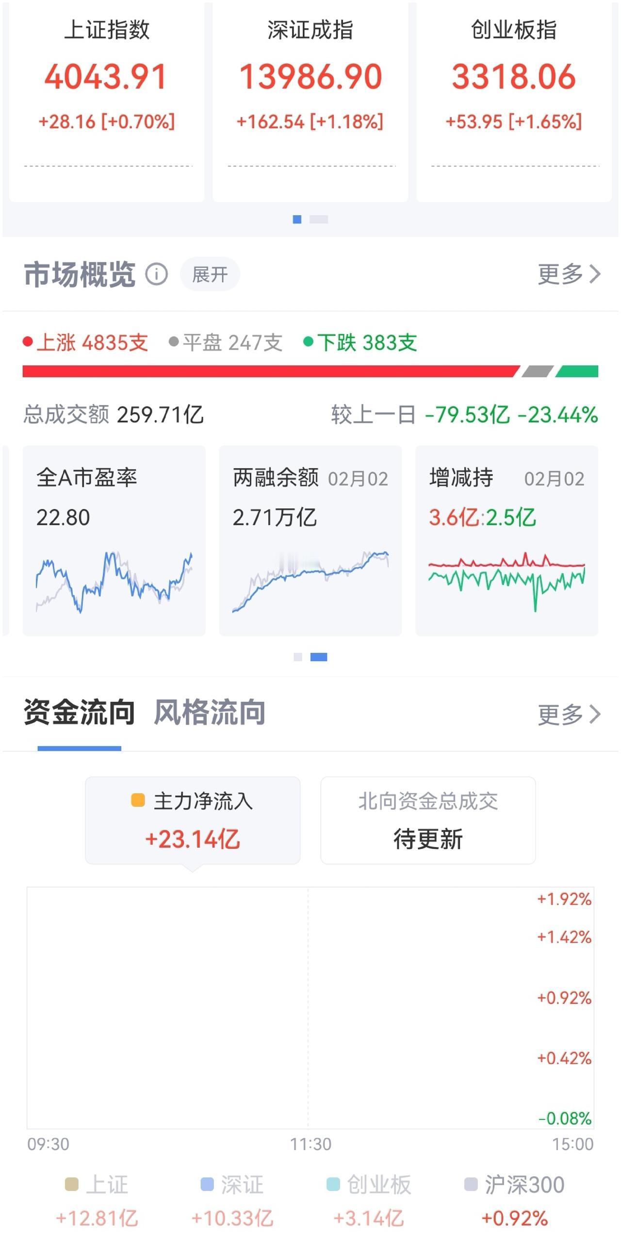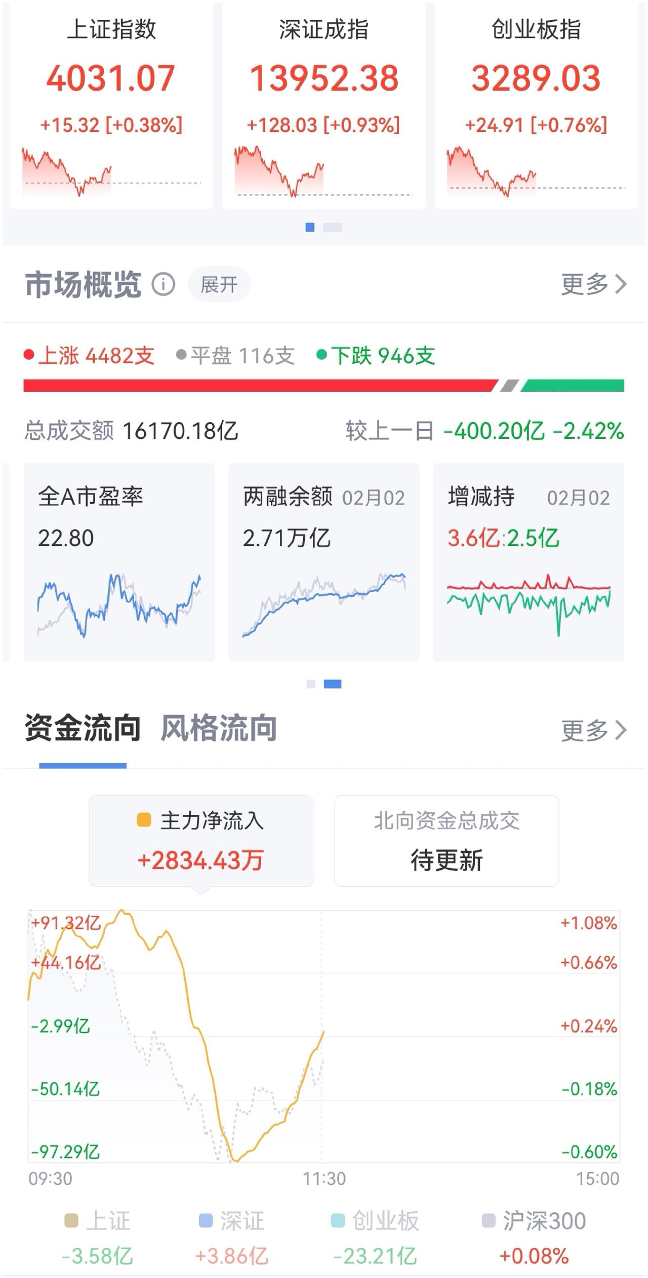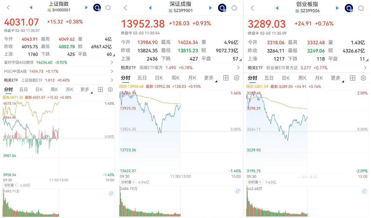 午盘印象(2月3日) 大宗余威 量能影响反弹 外围:美股上涨 英伟达逆势下跌 影响负面 内股:大宗惯性下探 量能不济 反弹无力 一、三大股指开涨: 指数强势 个股开盘涨平跌比率88%:5%:7%。 个股开盘超强势(+81 Vs -44个百分点), 强势反弹, 二、早盘指数高开跳水 多日受大宗商品压抑,个股反弹急切 半日1.60万亿,量能继续萎缩 三、涨跌幅榜: 航天引领科技反弹 红利回调 大宗惯性下探 跌幅前列:贵金属和化石能源、大金融、 涨幅前列:光伏、航天军工、稀土永磁 四、开盘和午盘: 开盘:沪+0.70%、深+1.18%、创+1.65%。 午盘:沪+0.38%、深+0.93%、创+0.76%。 大宗惯性弱势,指数高开又跳水稍回温,ETF痕迹不见 五、午盘个股上涨81%,与昨日涨跌差距(+64 Vs -31个百分点),个股大幅回暖 相比开盘,涨跌差稍减,上涨个股略减 净流入+0 (-391)亿,资金走平大幅改善 六、沪深两市成交量午盘16,040亿,上个交易日16,425亿,同比量能萎缩近400亿,高开难维系,跳水又回升。 七、指数欲反弹,量能低位难如愿 融资额前日大减-235亿,昨日降-60亿,降杠杆压力减轻。高开反弹,无奈量能大幅萎缩,回调震荡 午后两种情形: 1、横盘震荡:大宗影响余威,时间换空间,震荡消化获利盘。 2、震荡上涨:冲破大宗压制,大起大落,慢牛格局未变。 (图片源自网络侵权告知删除)