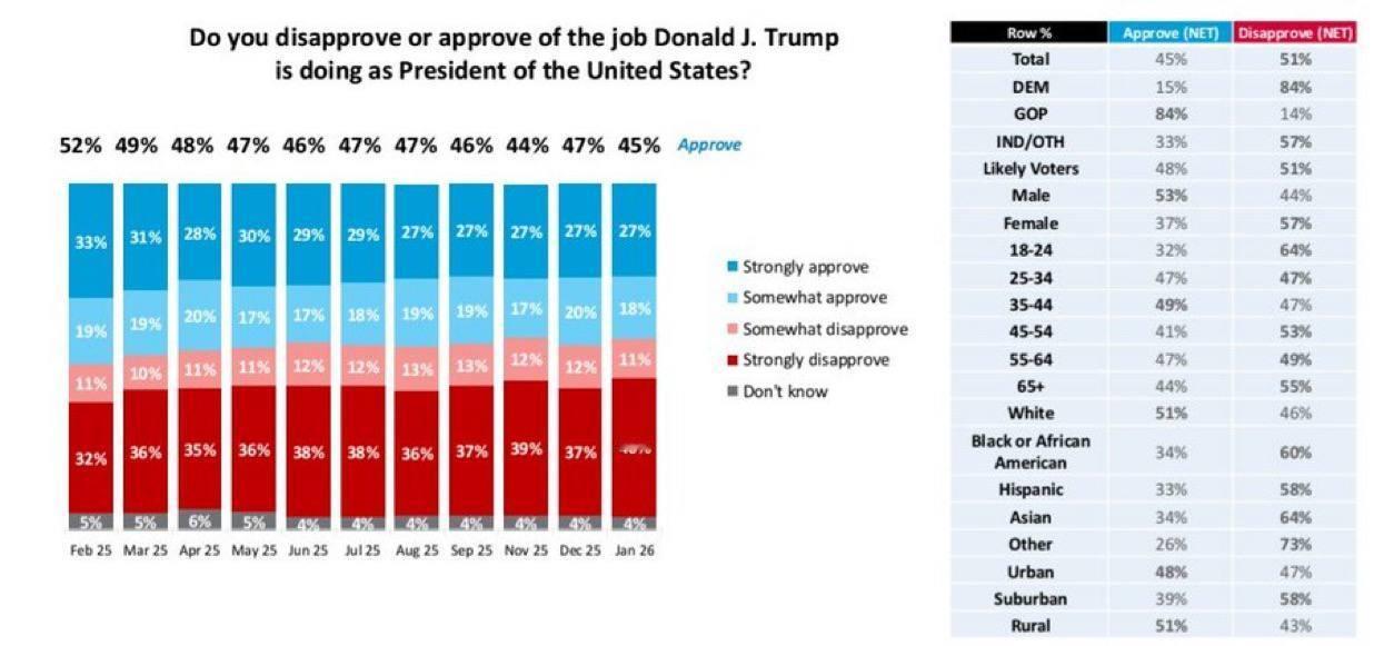 数据来源:哈佛/哈里斯民调,2026年1月28–29日。哈里斯民调是1963年由路易斯·哈里斯创立的,是美国最早进行全国性民意调查的机构之一,和前副总统哈里斯没关系。